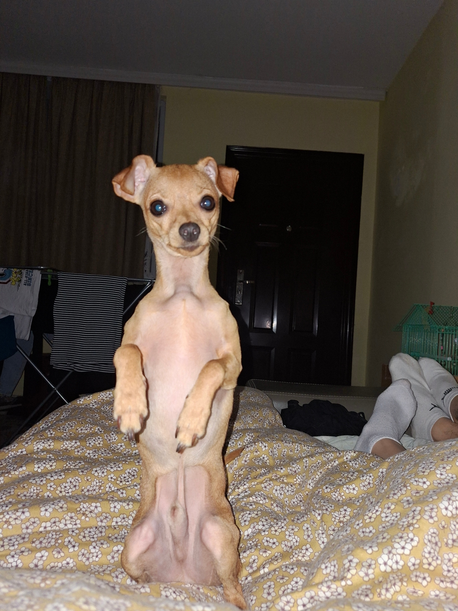 A tan Chihuahua lies on its back on a yellow floral patterned fabric, possibly a blanket or bedspread. The dog's belly is exposed, and its legs are extended upward. A person's legs, clad in white sock…read more