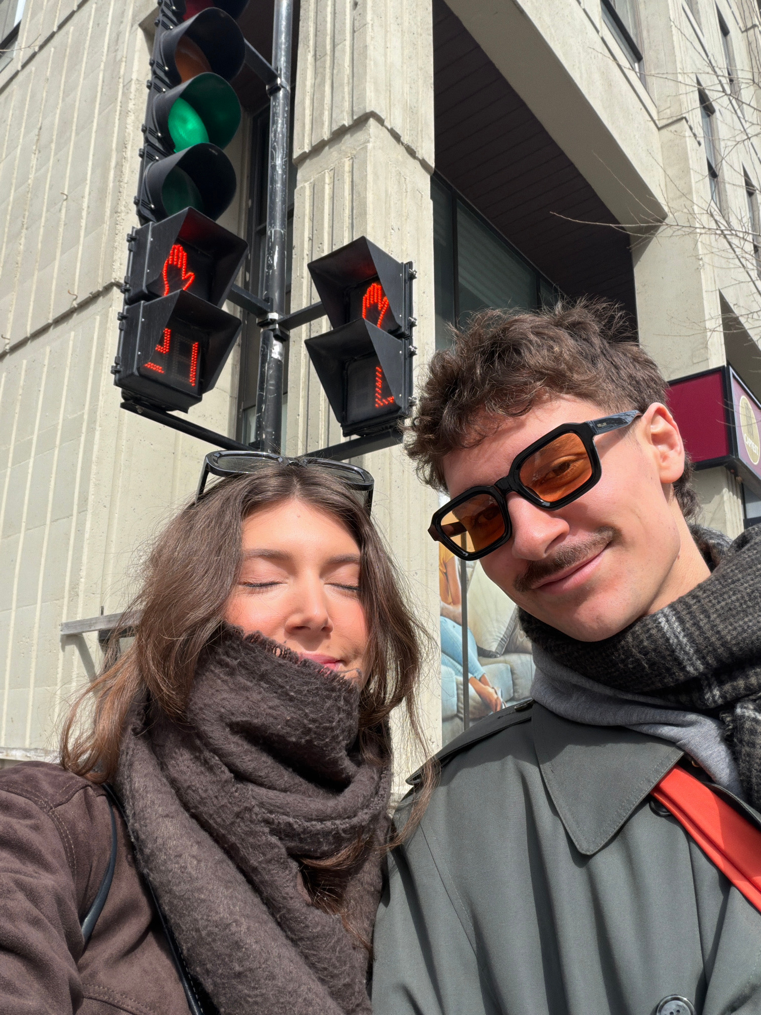 Two individuals are visible: a person with curly hair wearing sunglasses and a gray coat, and another person with long hair wearing a scarf and a brown jacket. They appear to be posing near a pedestri…read more