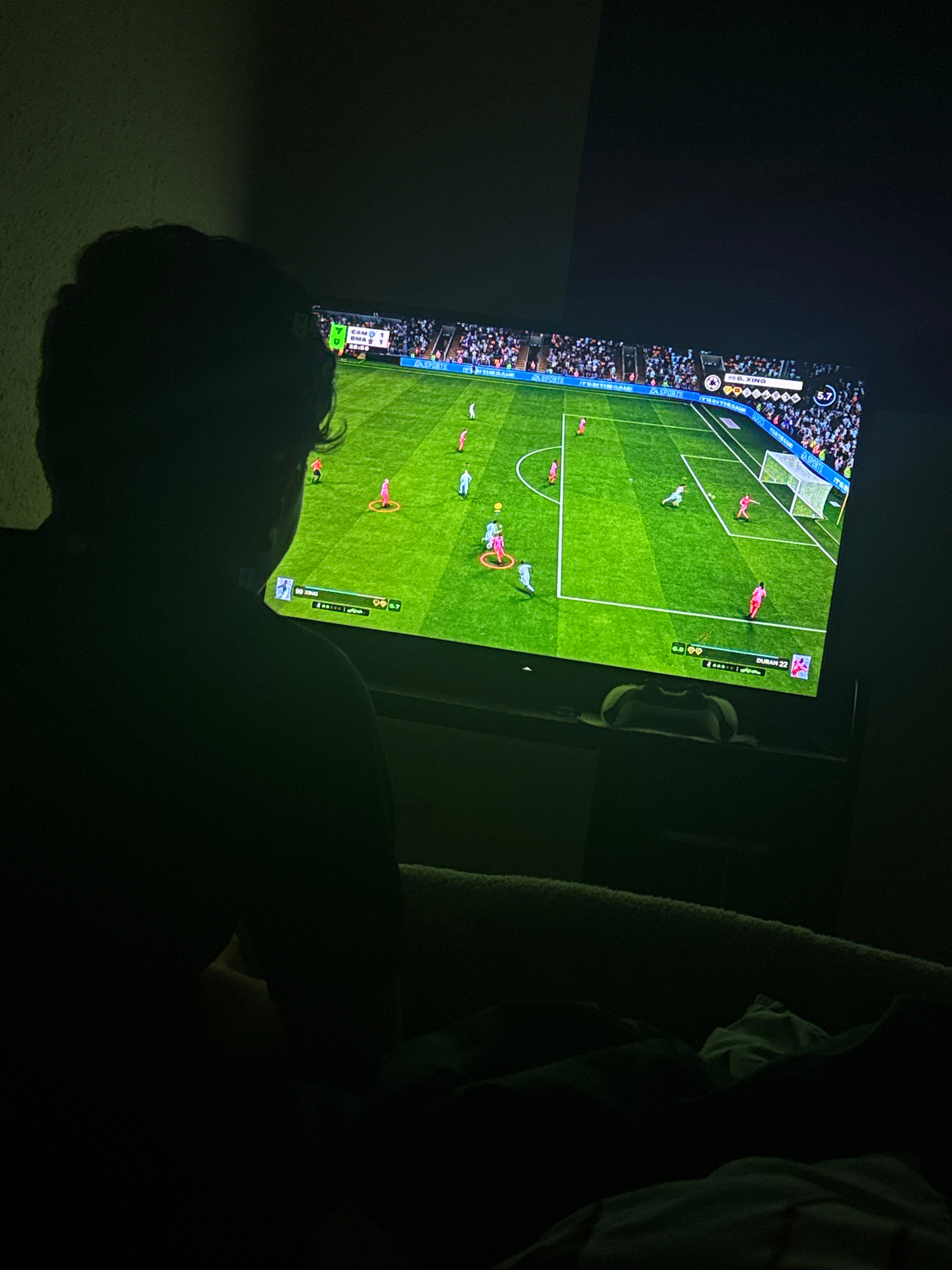 A person is lying down in a darkened room, facing a television. The television displays a soccer video game, with a view of the green field, players, and goal. The scoreboard indicates the game is bet…read more
