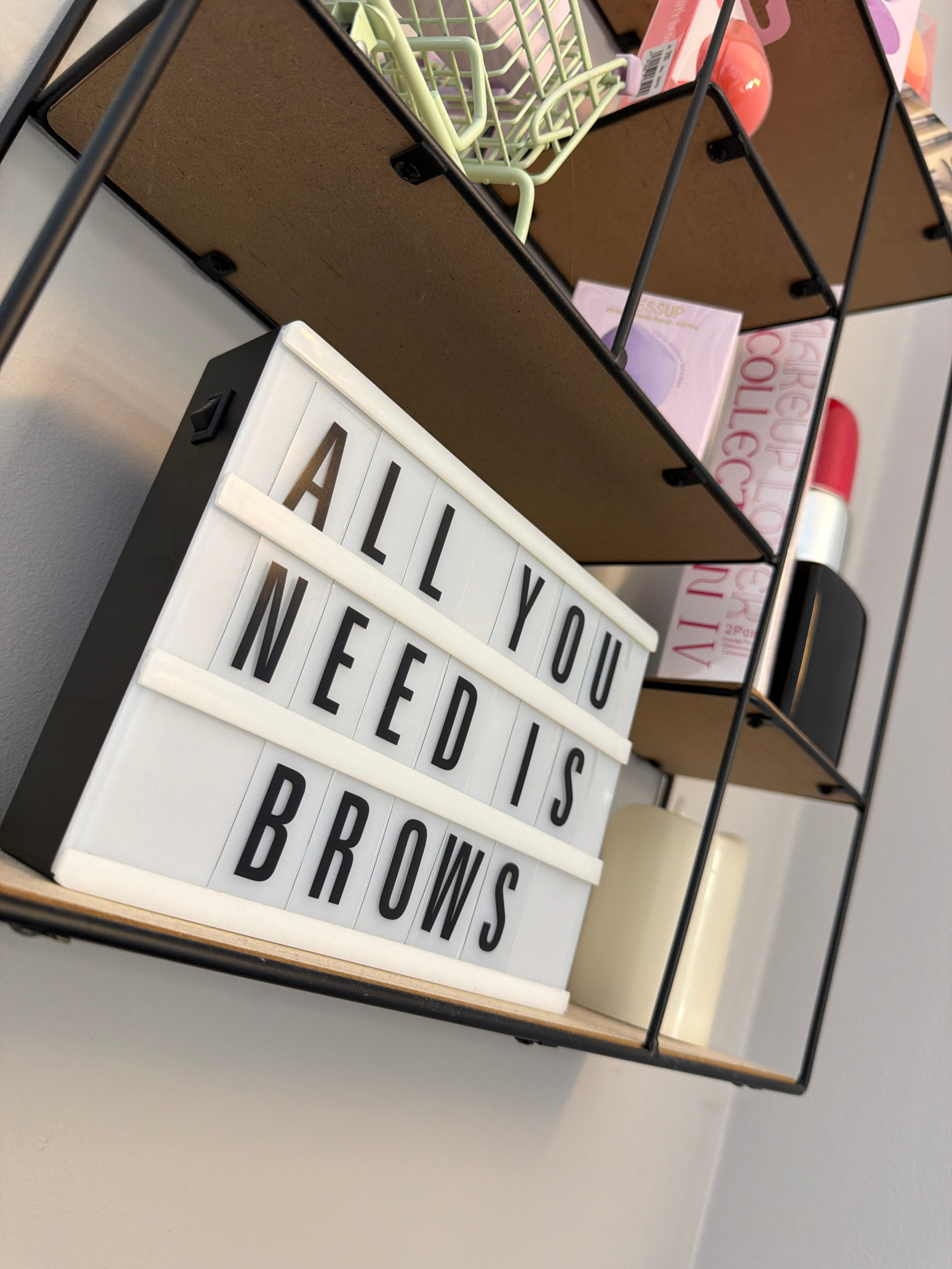 A high-angle, medium shot shows a section of a black wire makeup organizer sitting on a light gray surface. Within the organizer, various items are stored. There's a miniature shopping cart filled wit…read more