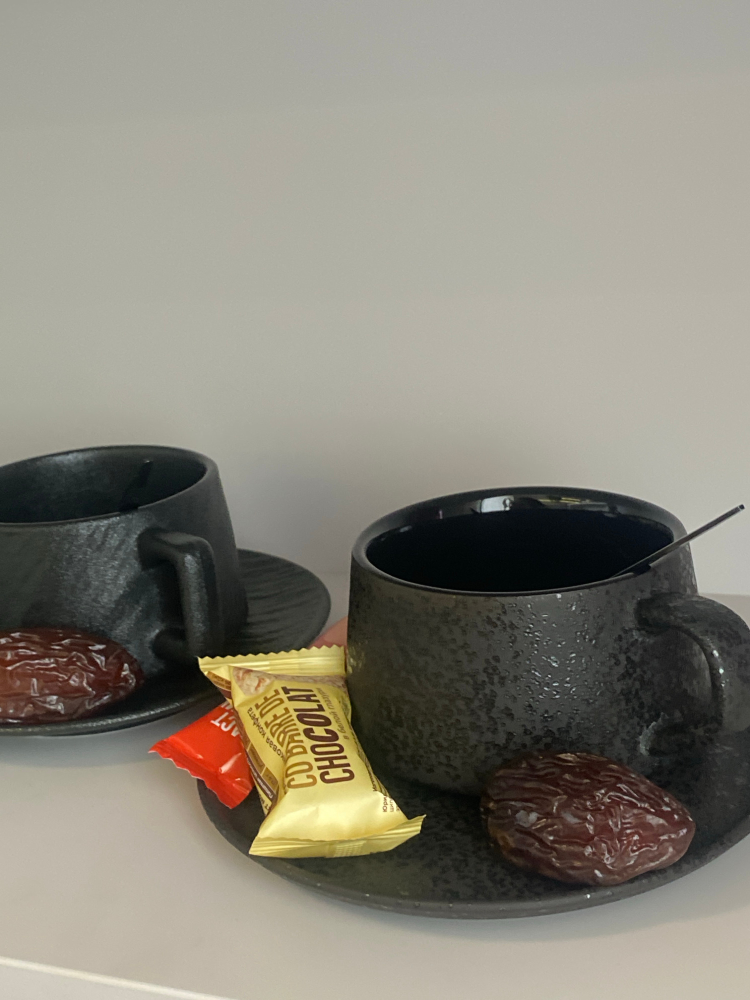 Two black cups and saucers are stacked on top of each other, angled to the right, with a date and a wrapped chocolate candy bar on each saucer. The scene appears to be indoors, against a light-colored…read more