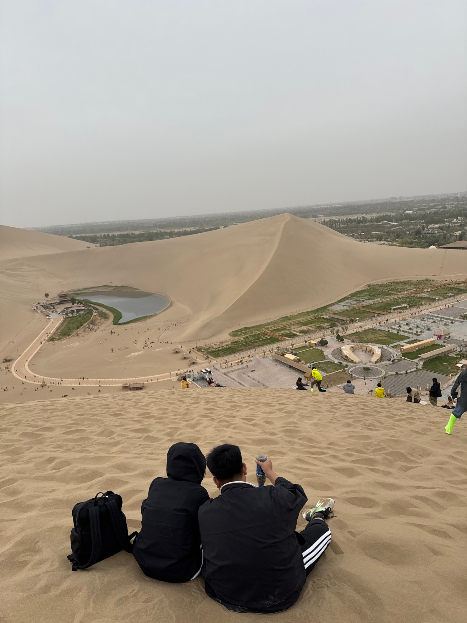 Two people are sitting in the sand, looking out over an expansive sand dune landscape. In the distance is an oasis with a lake and some buildings. Beyond the dunes, there are trees and buildings sugge…read more