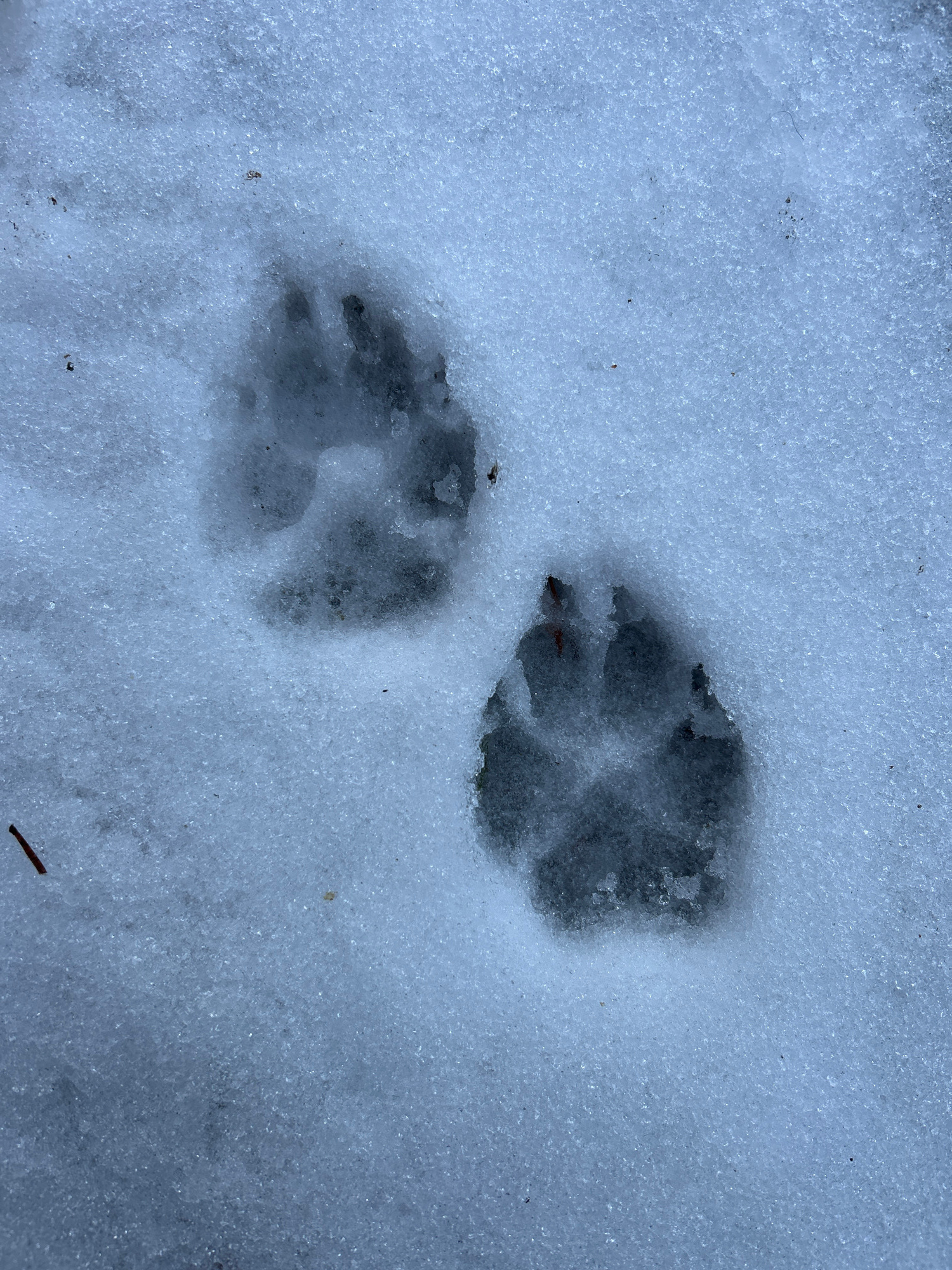 The image shows two animal tracks in the snow. The tracks appear to be from a quadrupedal animal, likely a dog or wolf, based on the four-toed imprint in each track. The surrounding environment is cov…read more