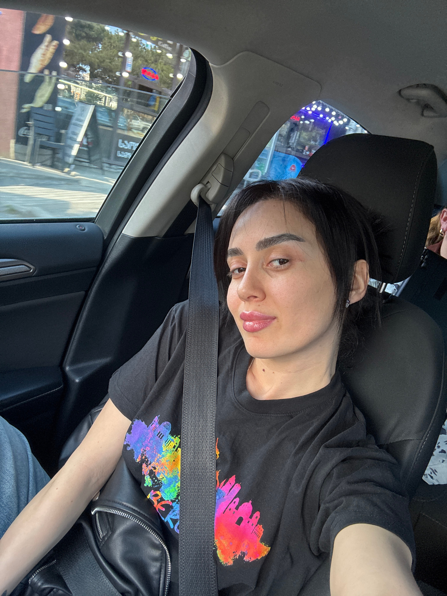 The image shows a person in the passenger seat of a car in Tbilisi, Georgia. The person has dark hair and is wearing a black t-shirt with a colorful graphic. A seatbelt is across their chest. Outside…read more