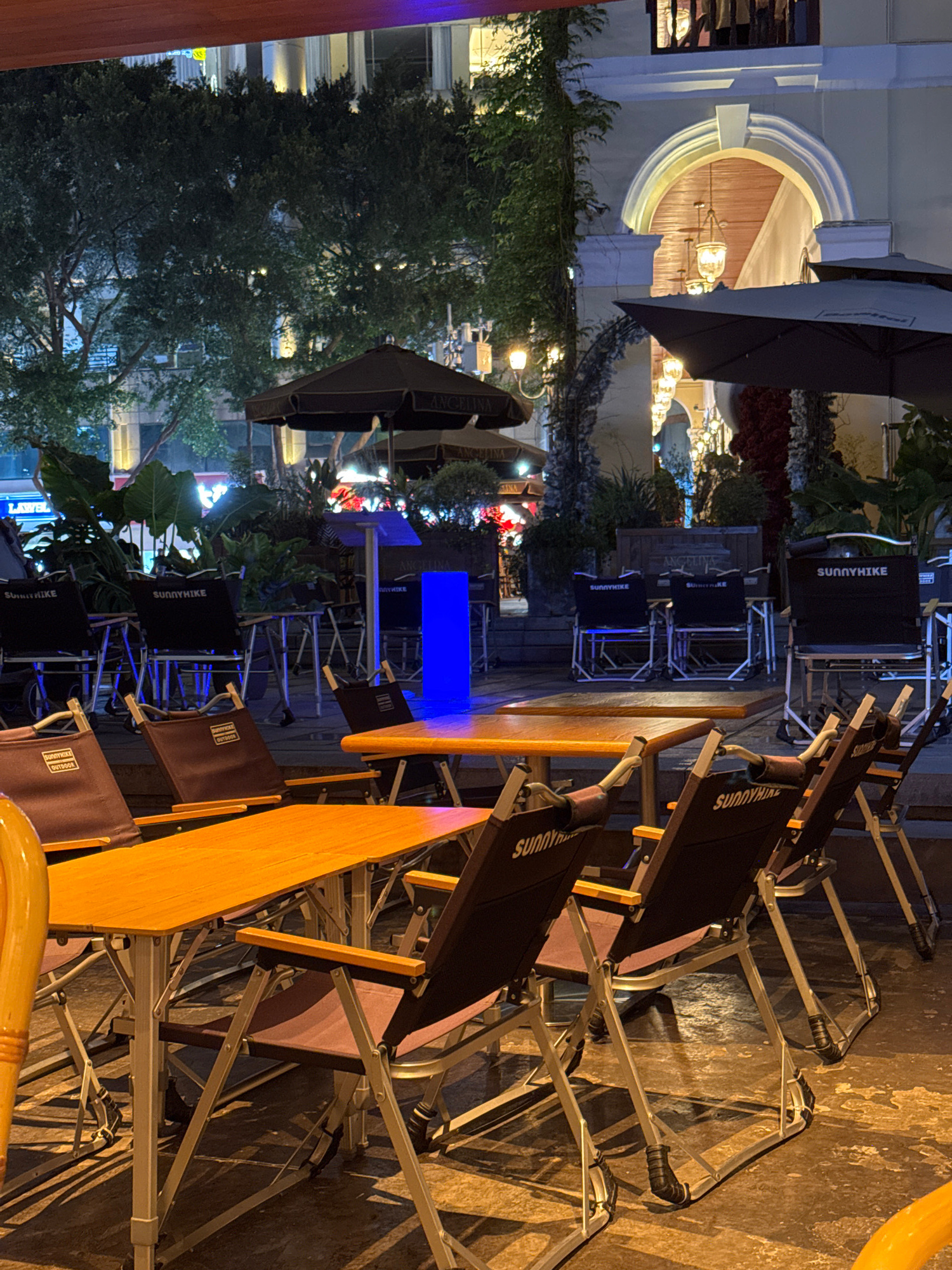 The photograph shows an outdoor seating area in Yuzhong District, China. The scene includes multiple metal-framed chairs with black fabric backs that read "SUNNYHIKE OUTDOOR", placed around wooden tabβ¦read more