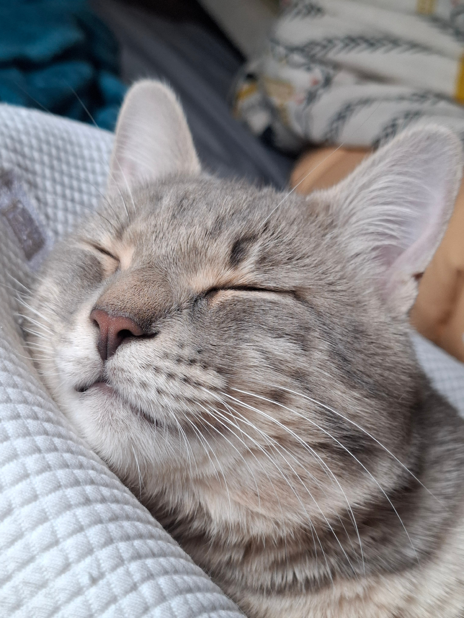 A close-up photograph depicts a light gray tabby cat sleeping peacefully. The cat's head rests on a white quilted surface, possibly a blanket or pillow. The cat's eyes are closed, and its pink nose is…read more