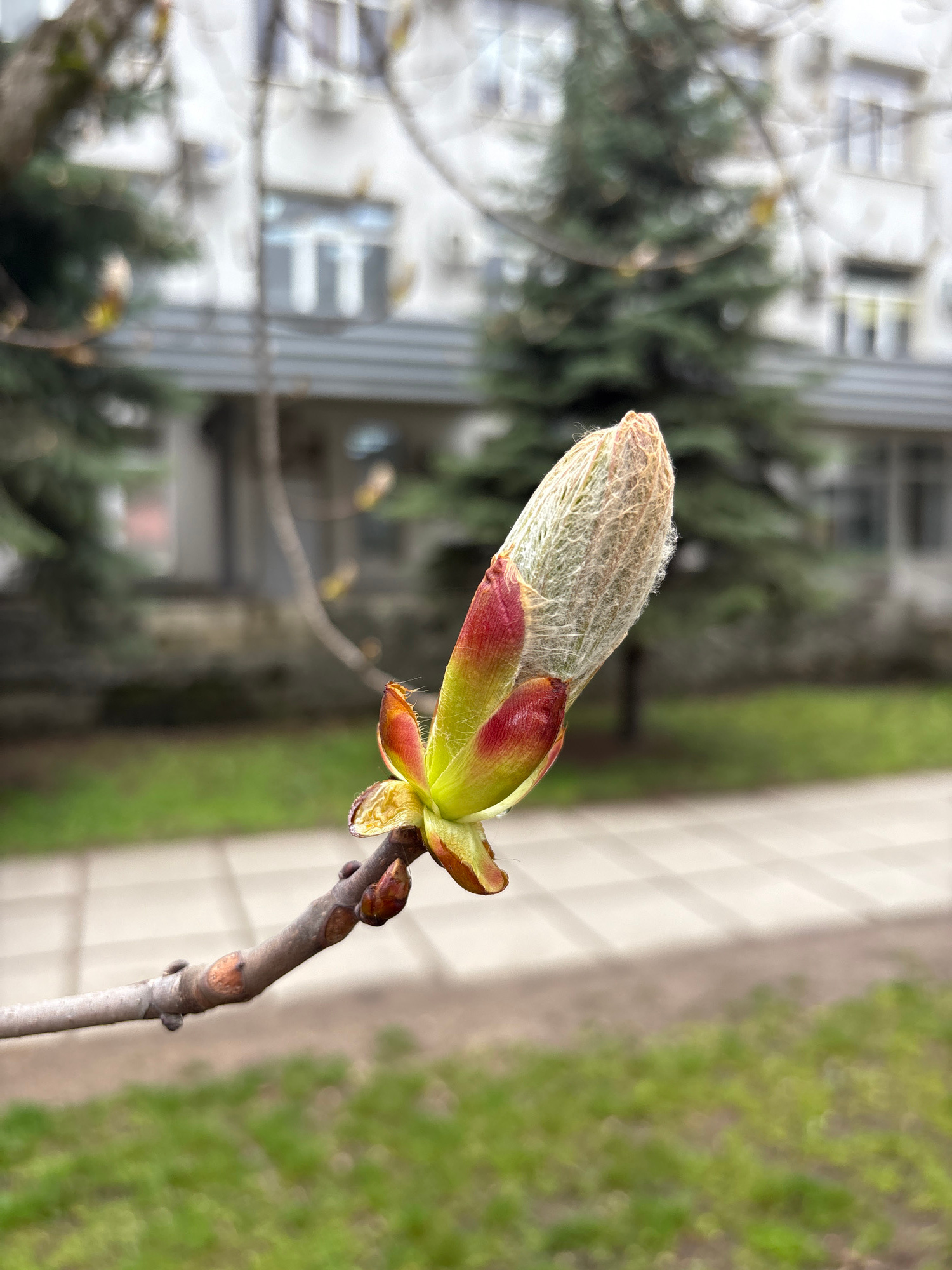 A close-up shows a horse chestnut bud on a tree branch, positioned slightly off-center. The bud is predominantly light brown and covered in soft, fuzzy hairs, with hints of green and red at its base.…read more