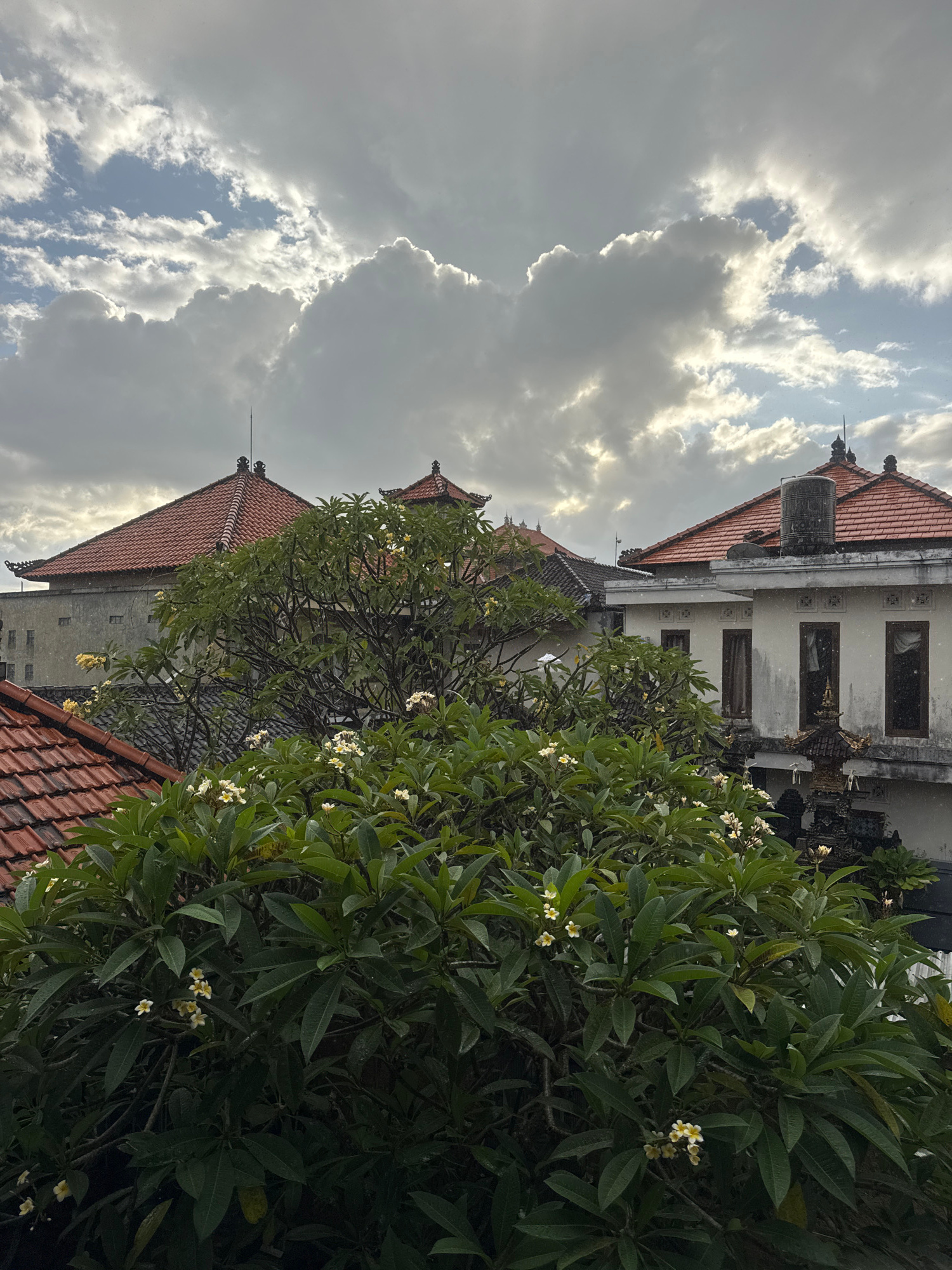 The image captures a partially obscured view of buildings with red tiled roofs in Kuta, Indonesia, under a cloudy sky with intermittent sunlight. A dense, green frangipani tree with small white flower…read more