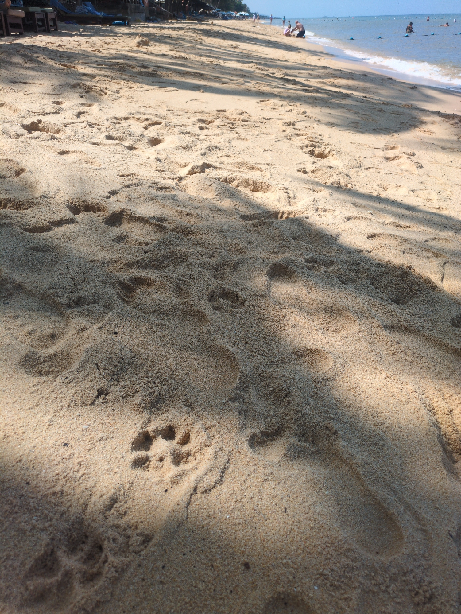 A beach scene at Phú Quốc, Vietnam. The sand is light beige, covered in footprints of varying sizes. A shadow stretches across the sand. The sea is visible in the background, with a few people in the…read more