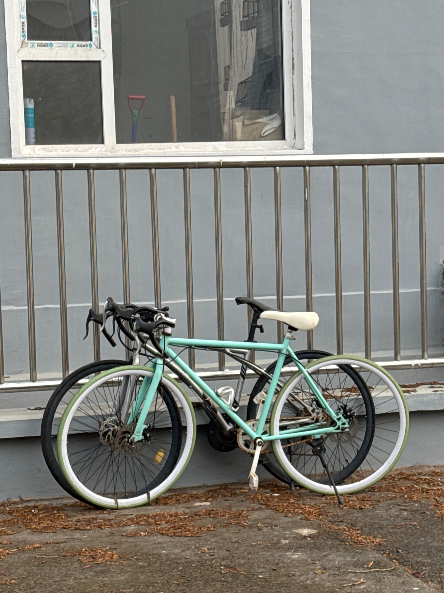 The image depicts a light-blue bicycle leaning against a gray building exterior in Zhongtun, China. The bike has white wheels and a white seat. A window is visible to the left, reflecting objects insi…read more