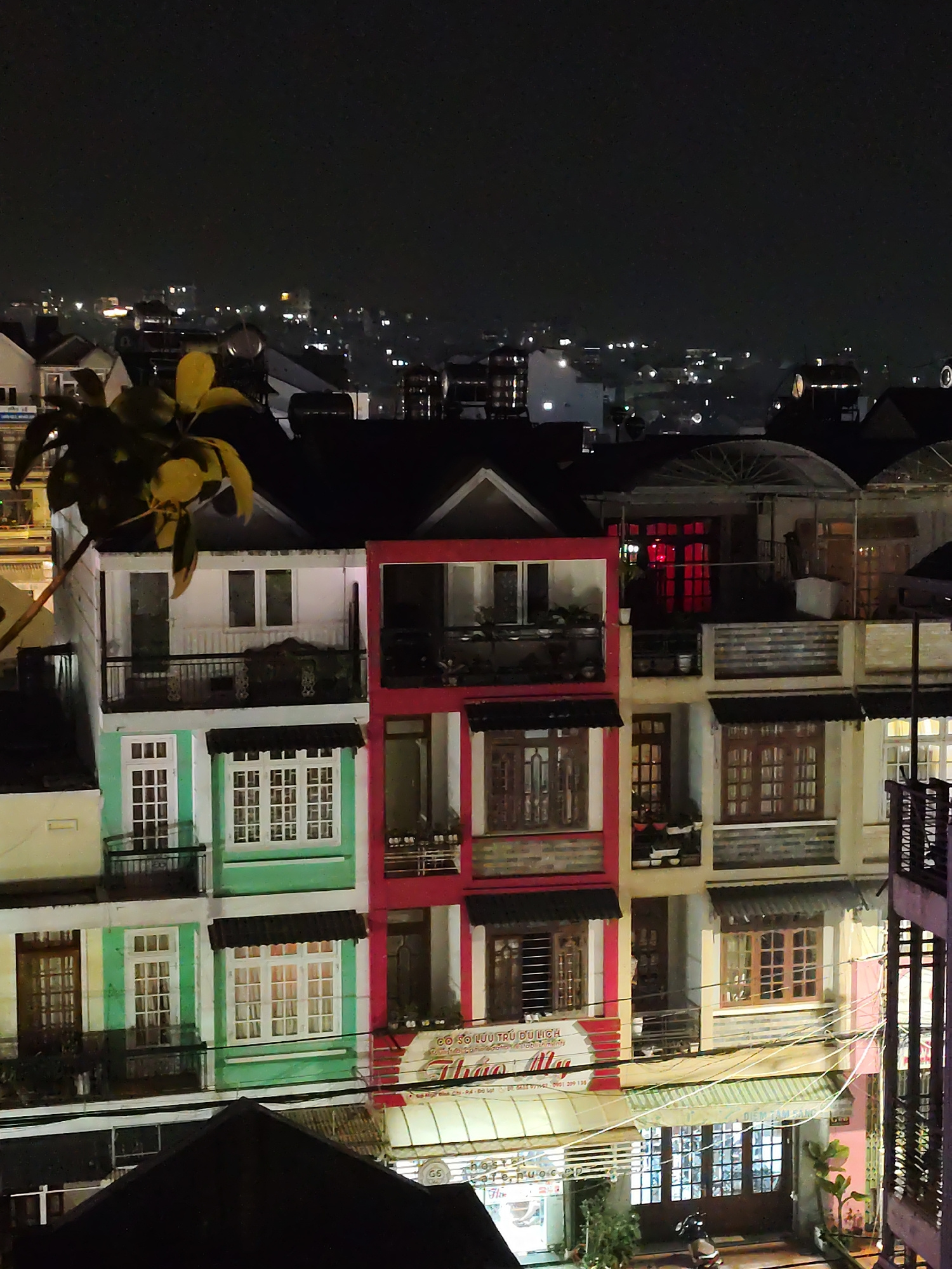 At night, the scene depicts a series of colorful buildings, likely located in Da Lat, Vietnam, given the architectural style and signage. The buildings, varying in shades of green, white, red, and offโฆread more