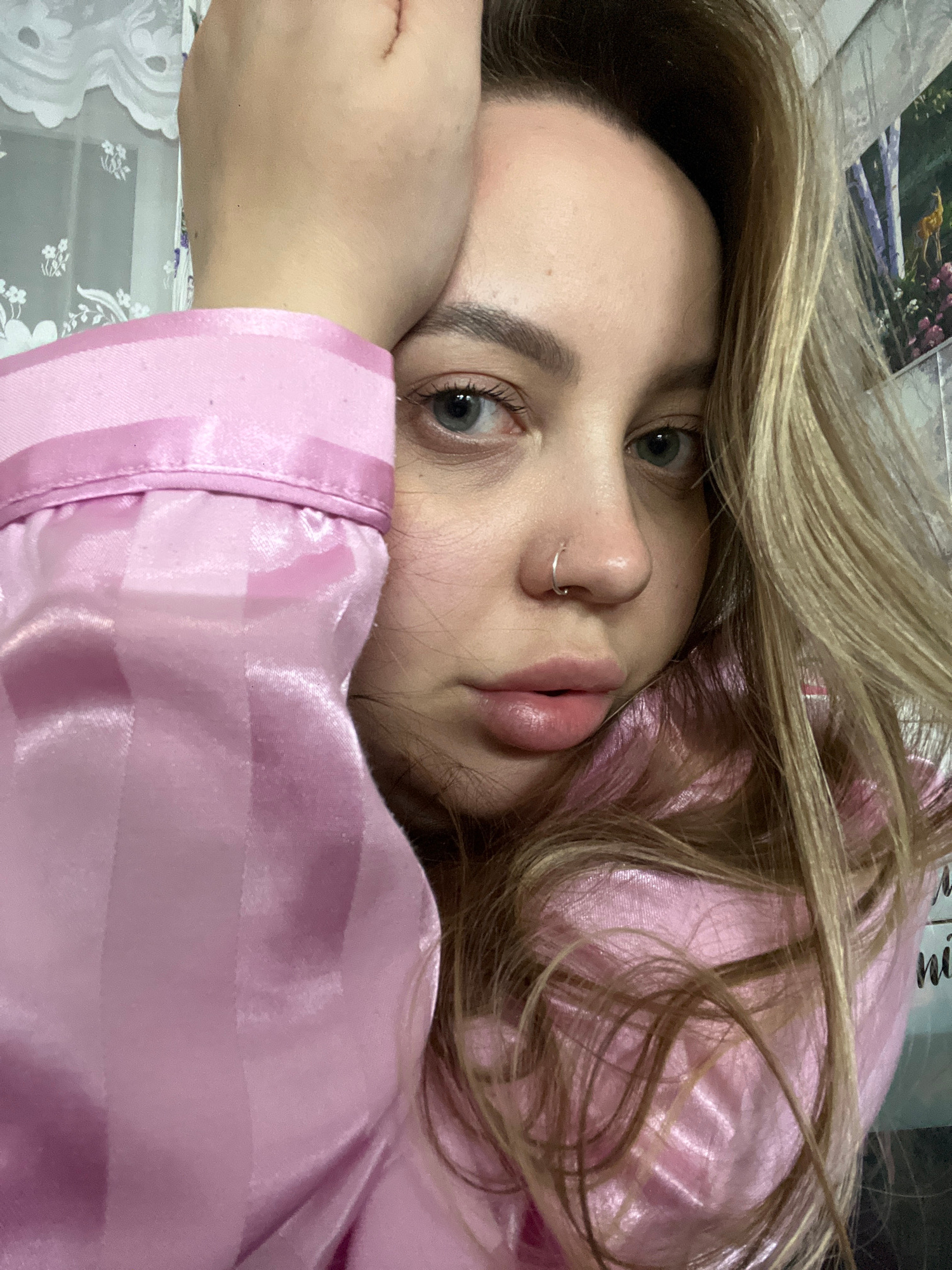 A blonde woman with a nose ring is lying down. She is wearing a pink satin pajama top. She is resting her head on her hand. The background includes a blurry image of what appears to be a landscape pho…read more