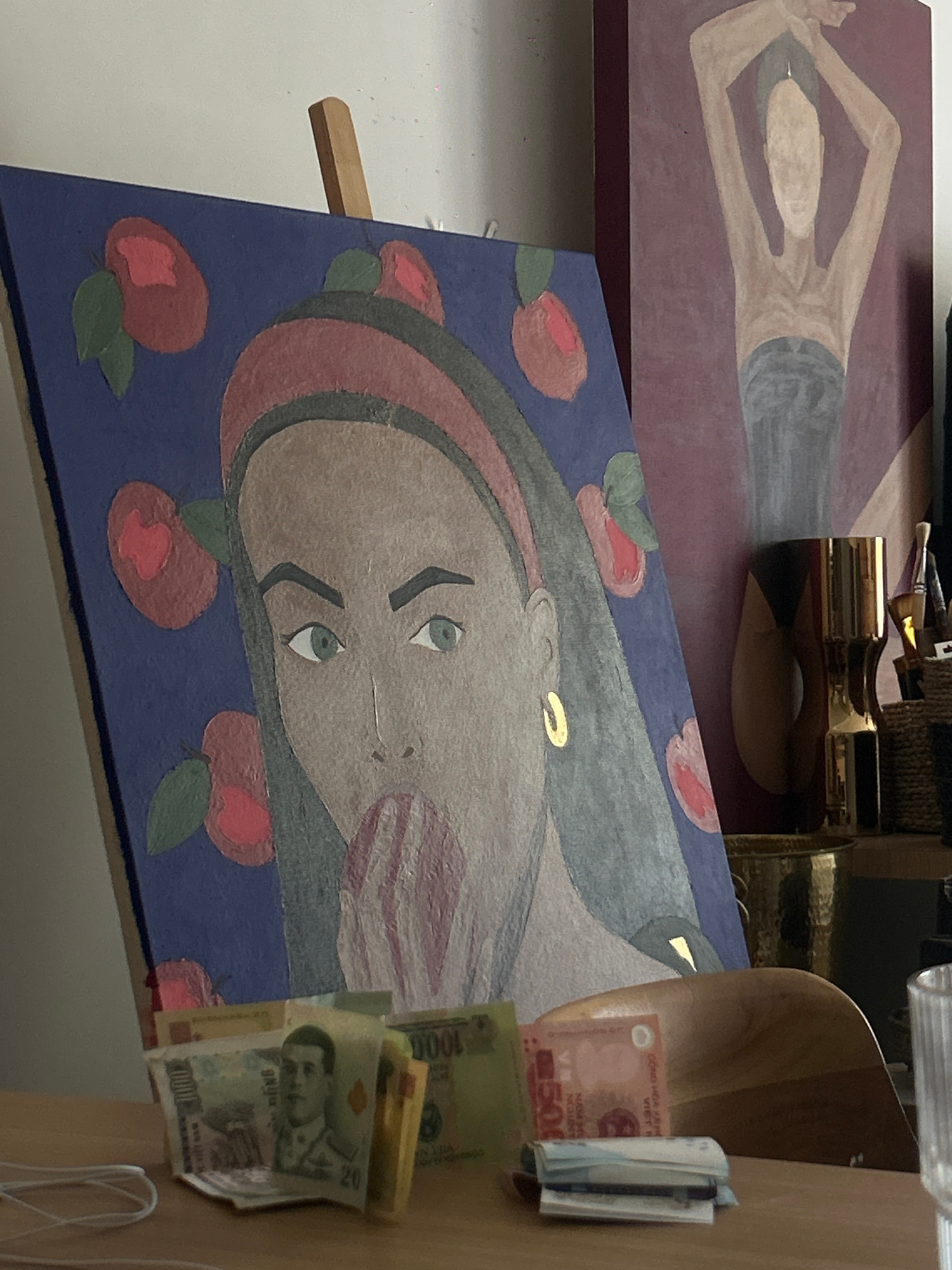 The image presents two paintings, one depicting a figure in a reclining pose and the other featuring a portrait of a woman against a blue background with red floral motifs. A stack of Indonesian curre…read more