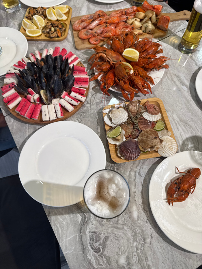 The image displays a tabletop setting laden with a variety of seafood and beverages in Voskevaz, Armenia. The table surface is grey with a mottled, marble-like pattern. A central round wooden board f…read more