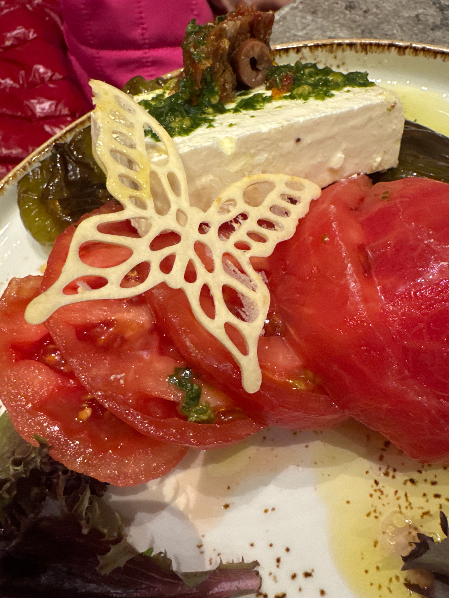 The image shows a plate of food, possibly in a restaurant. The plate contains sliced tomatoes stacked on top of each other. There is a white, rectangular block next to the tomatoes, possibly cheese wi…read more