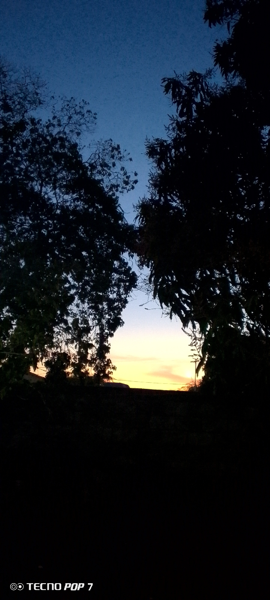 The image captures a twilight or dusk scene in an unspecified location in Altagracia, Venezuela. The foreground is dominated by dark, silhouetted foliage, likely trees, which frame a view of the horiz…read more