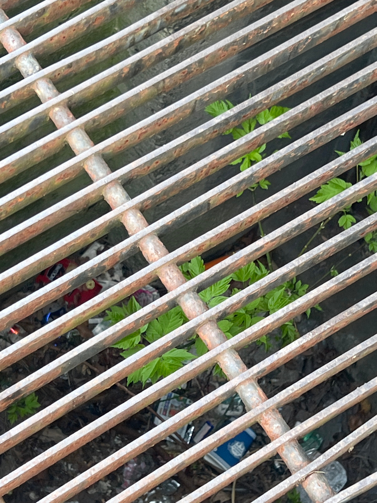 The image depicts a close-up view of a metal grate, likely a storm drain cover, with litter and some vegetation visible beneath it. The grate is composed of parallel bars and perpendicular supports. Dā¦read more