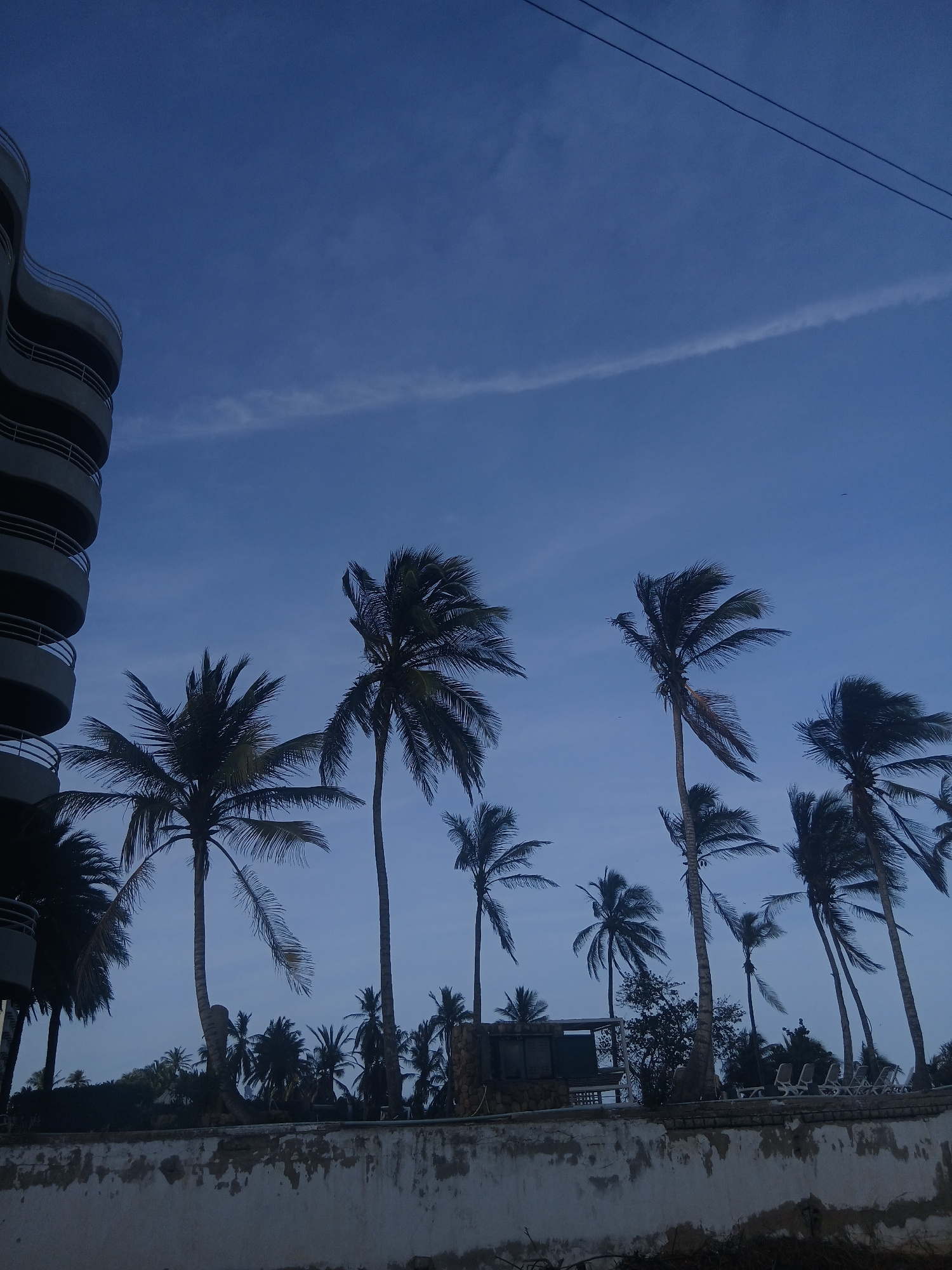 The image presents a low-angle view of the sky in Porlamar, Venezuela, showcasing palm trees and a building's architecture against a blue twilight sky. A contrail cuts diagonally across the sky, positβ¦read more