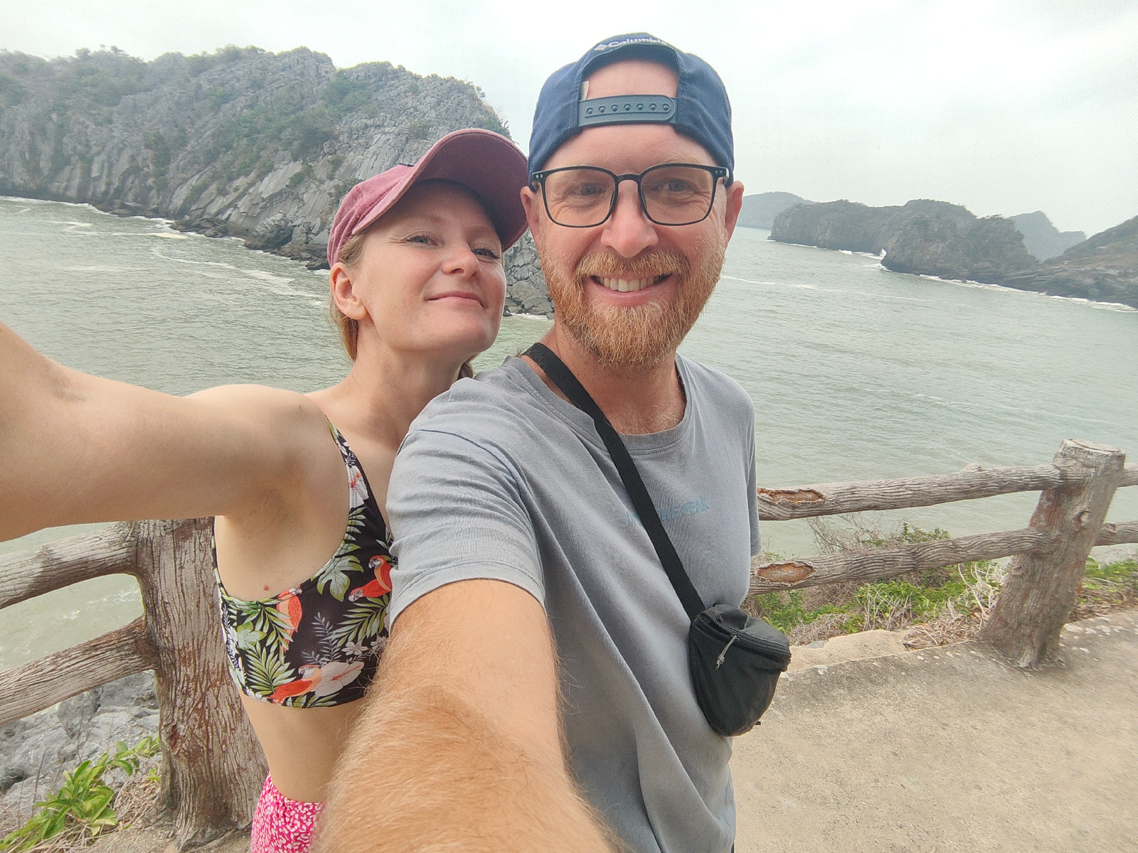 A man and a woman are taking a selfie on an overlook at Cát Bà Island, in Hải Phòng, Vietnam. The man, on the right, is wearing a blue baseball cap, glasses, and a gray shirt with a black fanny pack. He has a red beard and a broad smile. The woman, on the left, is wearing a pink baseball cap, a floral bikini top, and pink shorts. The backdrop features a body of water and rocky islands. A weathered wooden railing is visible in the foreground. The sky is overcast. | Open Wire