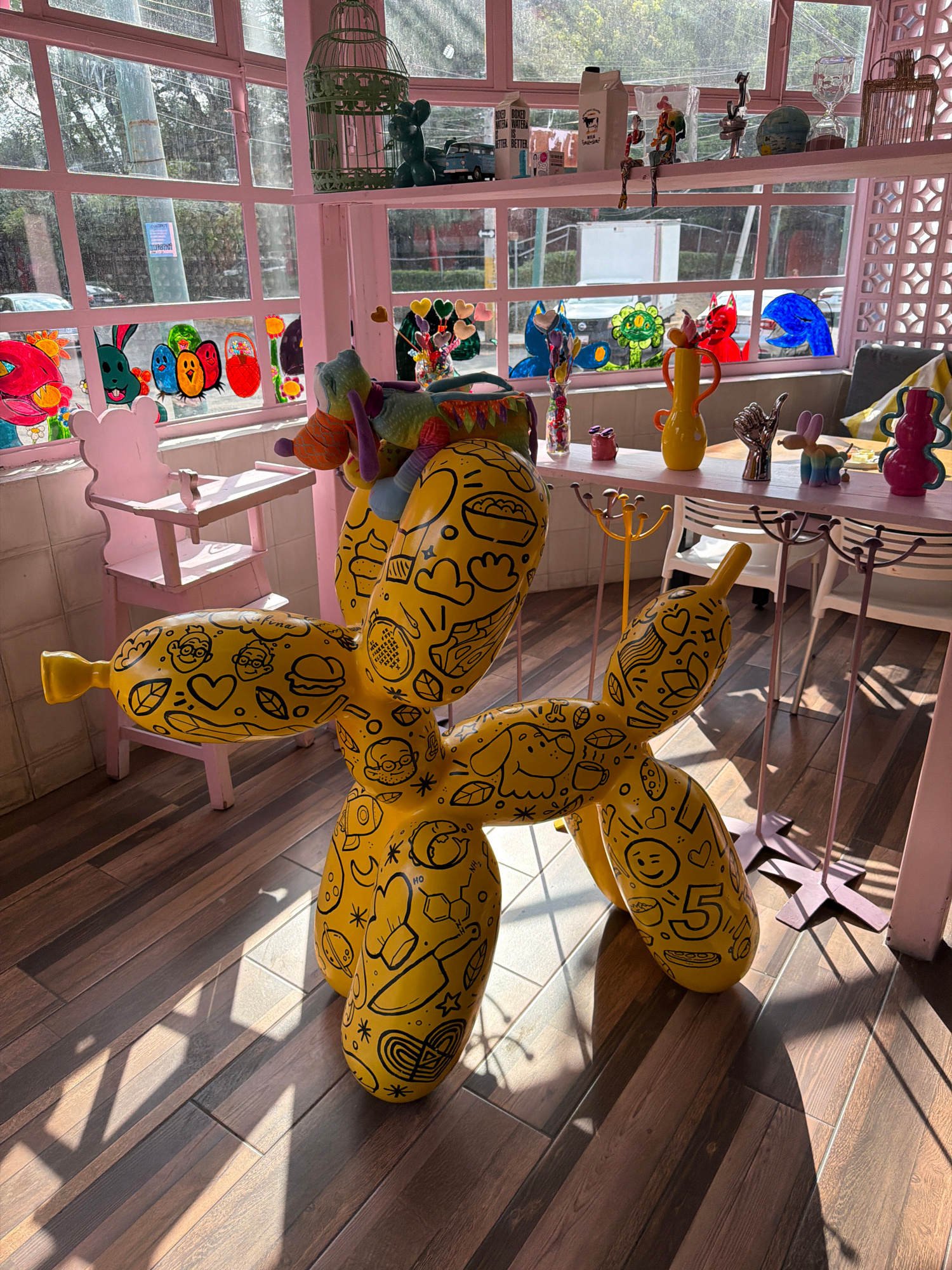 The image shows a yellow balloon dog sculpture with black doodle-like patterns on a light brown, wood-patterned floor. The sculpture is located inside a room with a pink-framed window. The window show…read more
