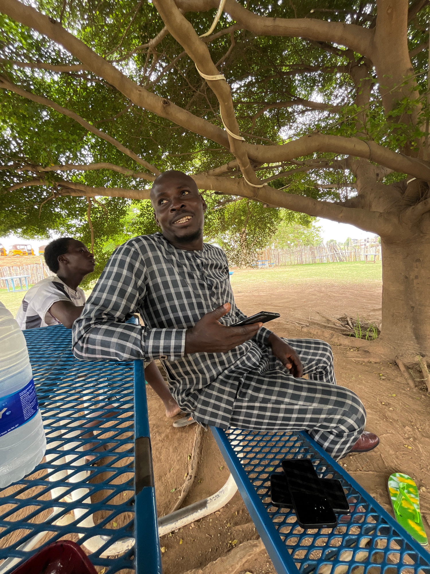 A man sits on a blue metal bench under the shade of a large tree. He wears a checkered shirt and pants and holds a phone in his hand. Next to him on the bench are two black smartphones. A pair of maro…read more
