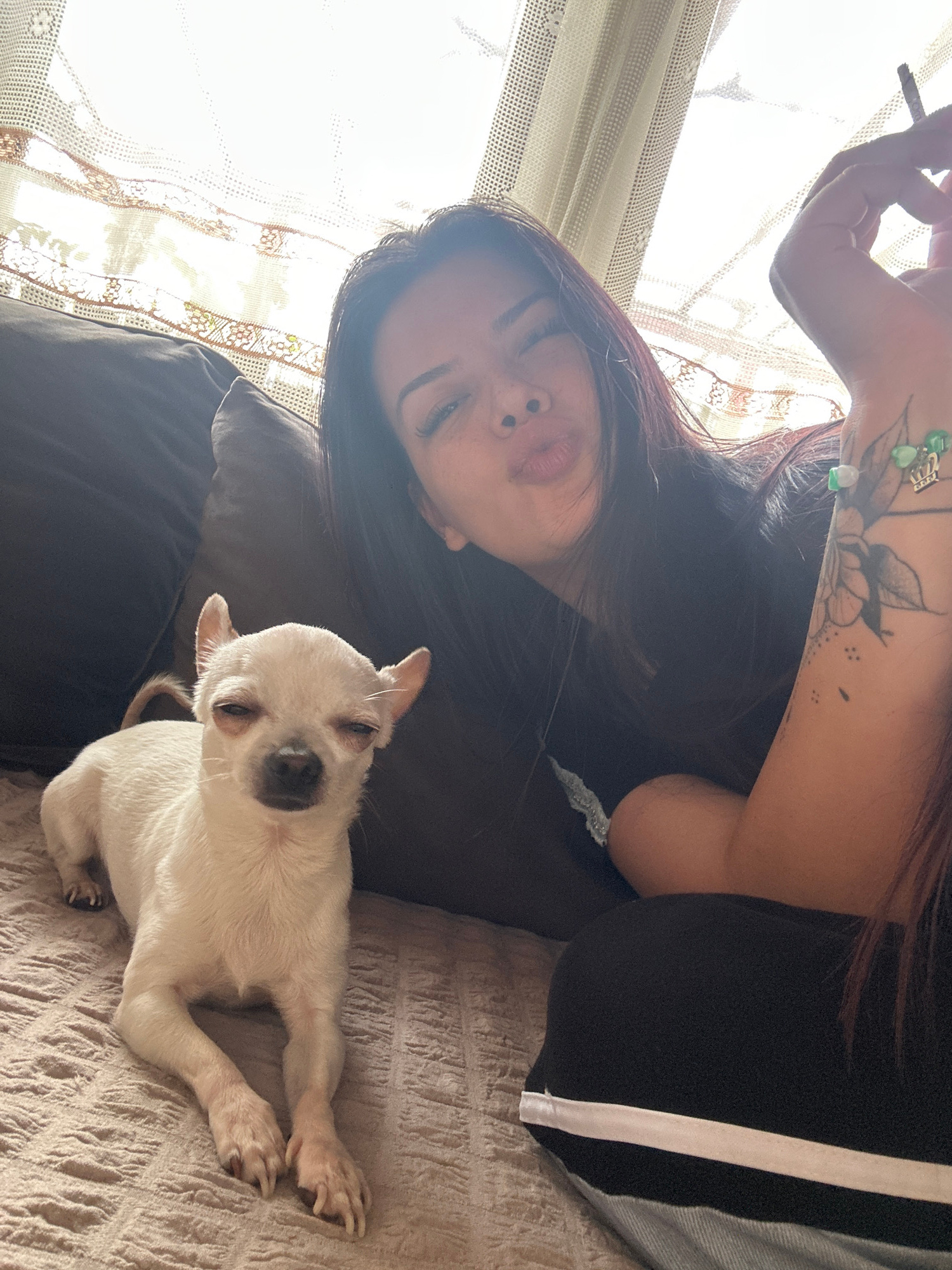 A woman with long, dark hair is lying down and taking a selfie with a small, white Chihuahua. The woman is wearing a black top with a white stripe along the side and has a tattoo on her left forearm.…read more