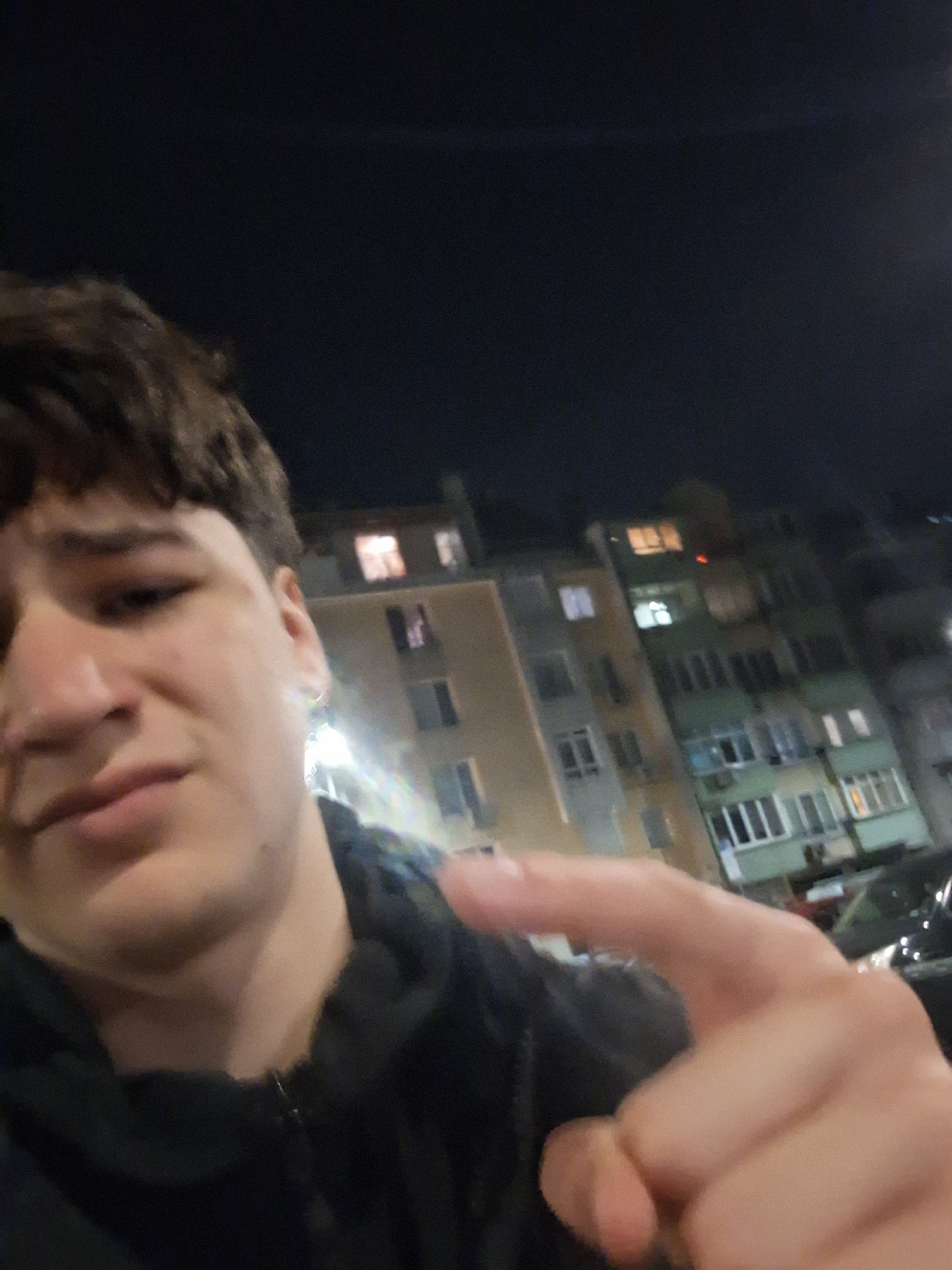 A selfie of a male taken at night in Burgas, Bulgaria. The male is holding up his thumb. Behind the male is a high rise building, partially obscured by darkness. Some windows are lit within the buildi…read more