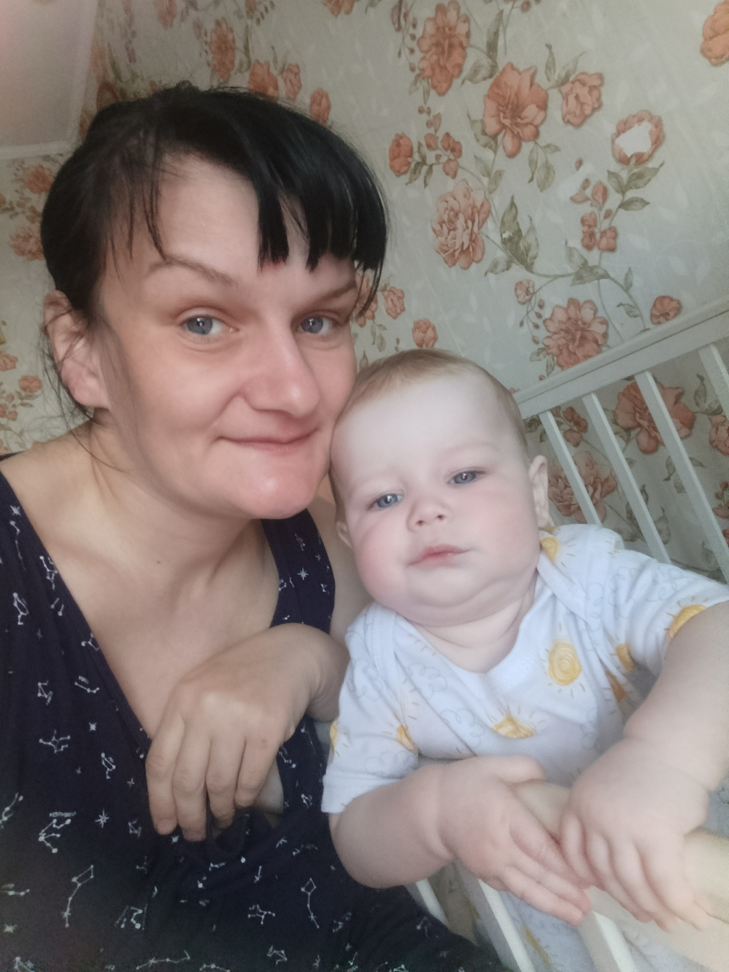 A woman with dark hair and blue eyes poses in a selfie with a baby. The woman is wearing a dark top with a white constellation pattern. The baby has light hair and blue eyes, wearing a white onesie wi…read more
