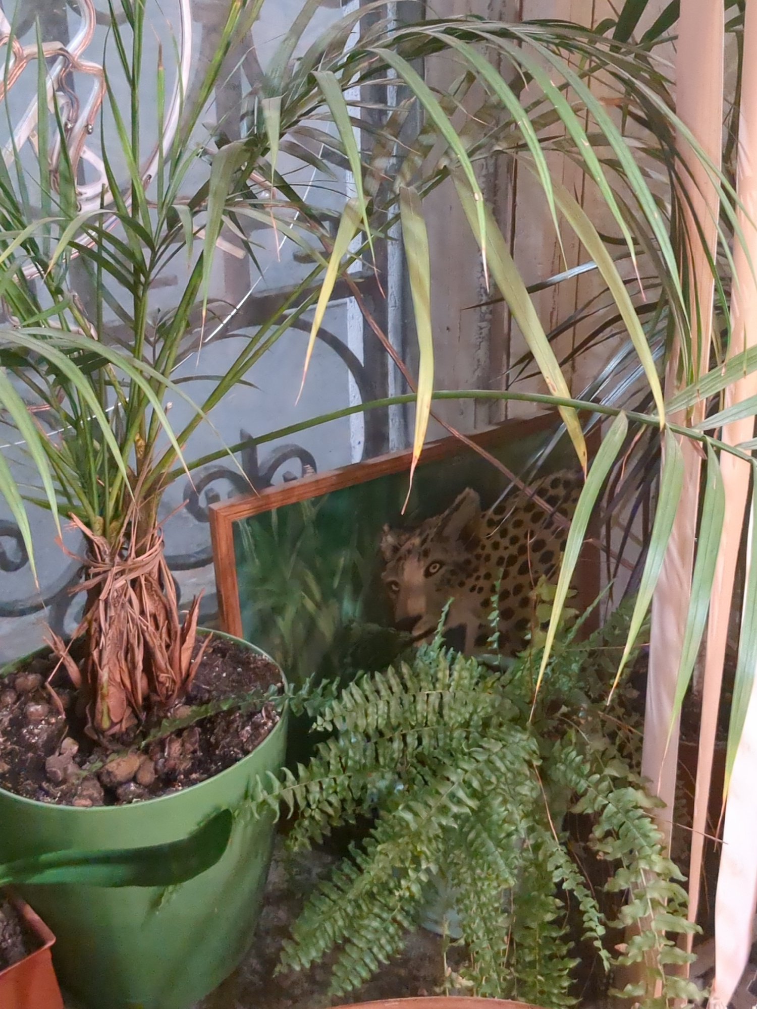 The image shows a table with two potted plants: one appears to be a palm and the other a fern in a green pot. There is a framed image on the table as well, which seems to feature a cheetah. The reflec…read more