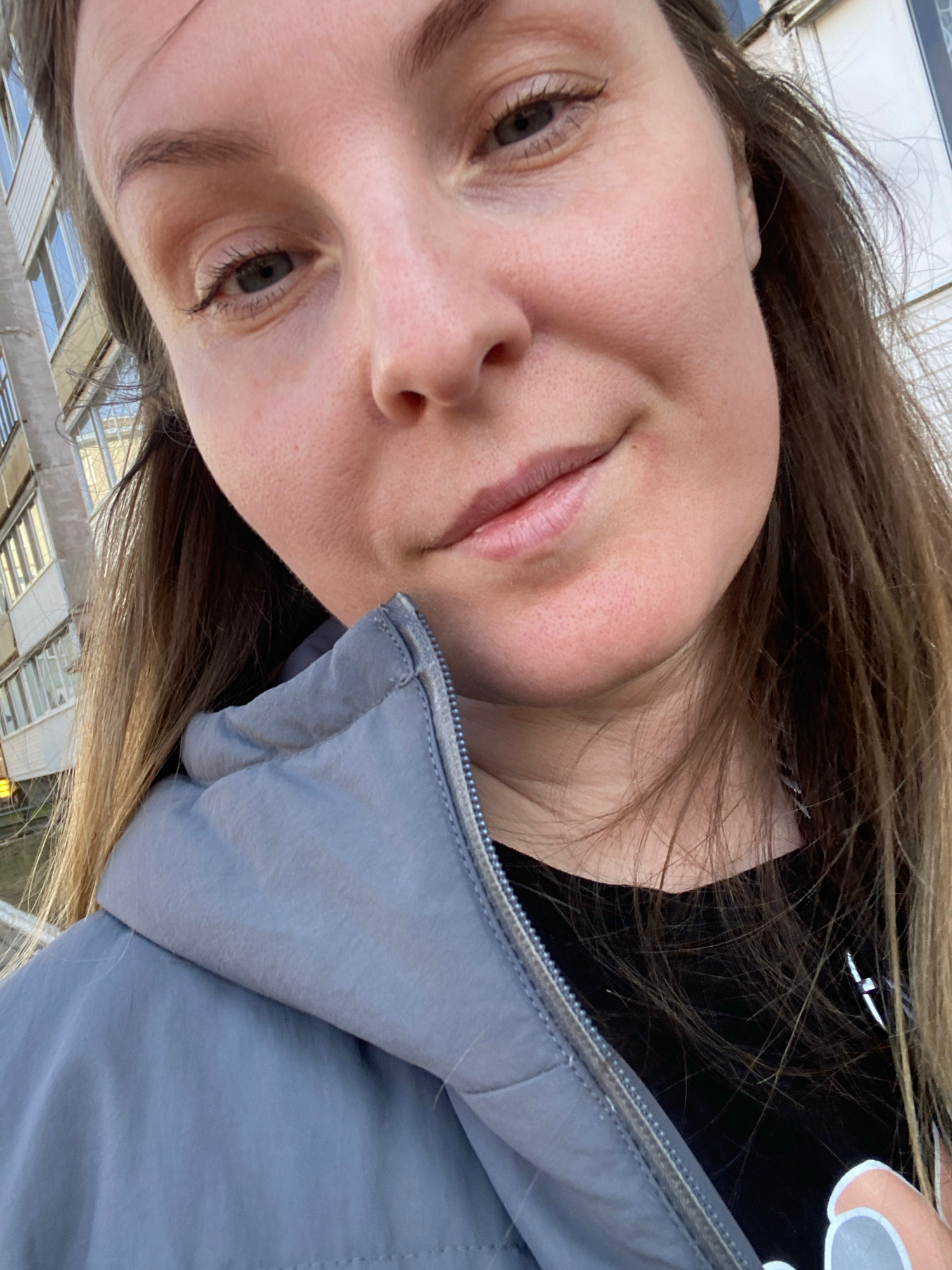 A young, fair-skinned woman with light brown hair is shown in a close-up selfie-style image. She has a slight smile and is wearing a black t-shirt with a white graphic design, partly visible, and a li…read more