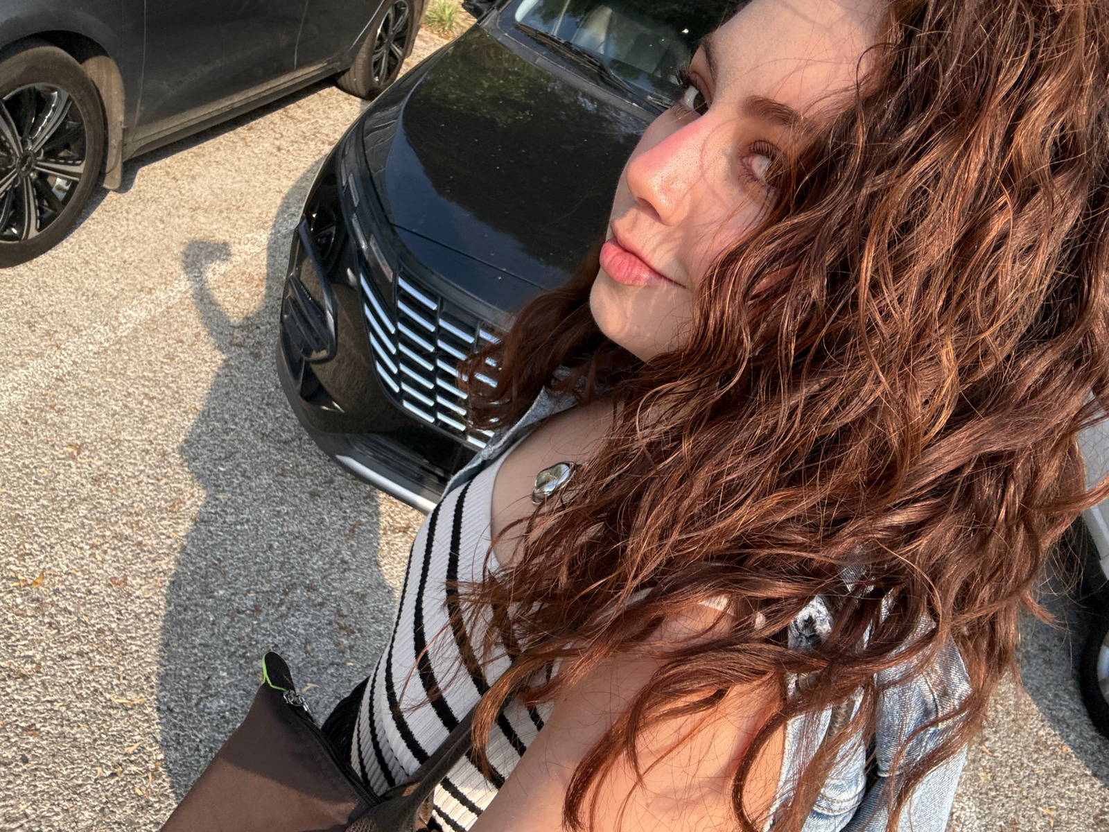 The image displays a young woman posing outdoors, seen from a slightly high and tilted angle. Her long, wavy brown hair, cascading over her shoulder and chest, is a prominent feature. She is wearing a…read more
