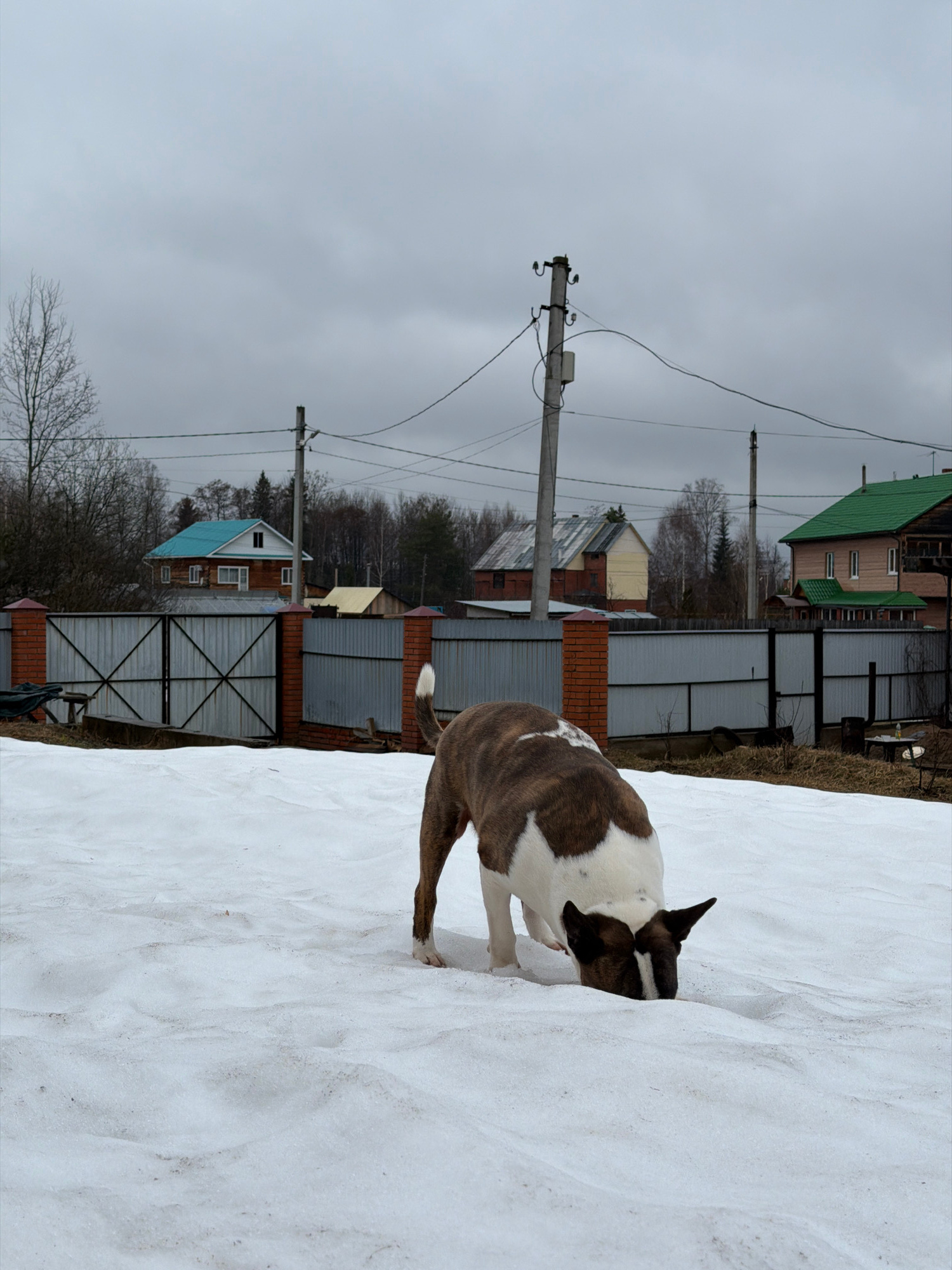 A dog is burying its head in a snowbank. The dog is primarily white with brown patches, short fur, and a short tail. The snow is white and appears slightly dirty. In the background, there are houses w…read more