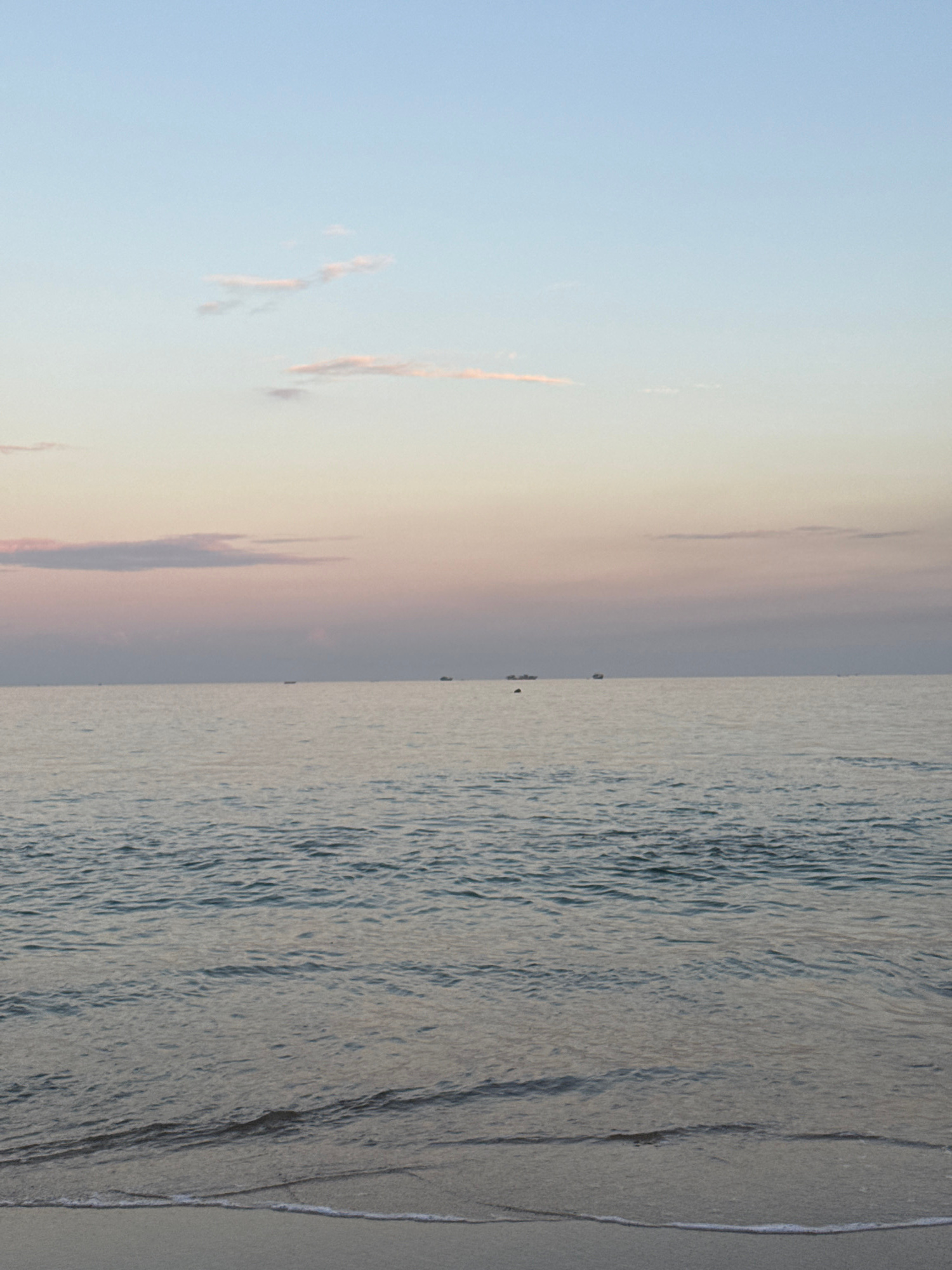 The image depicts a beach scene, likely in Kuta, Indonesia. The left side features a sky with a gradient from light blue to a soft, pale orange near the horizon, containing thin, wispy clouds tinged w…read more