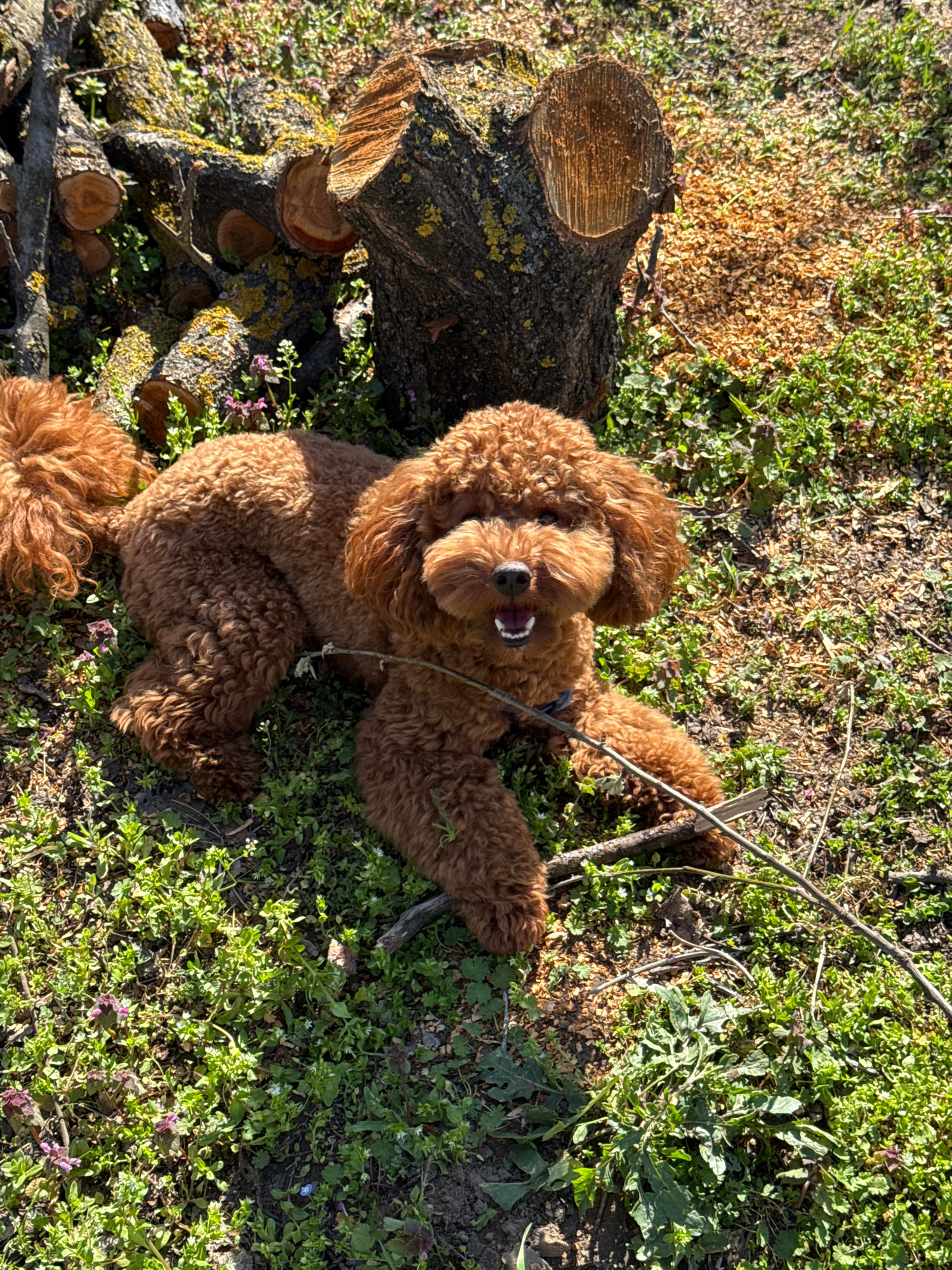 A brown poodle is lying on a patch of green grass and small plants next to a pile of chopped logs. The logs are cut into smaller pieces and have moss growing on them. The location is likely outdoors,…read more