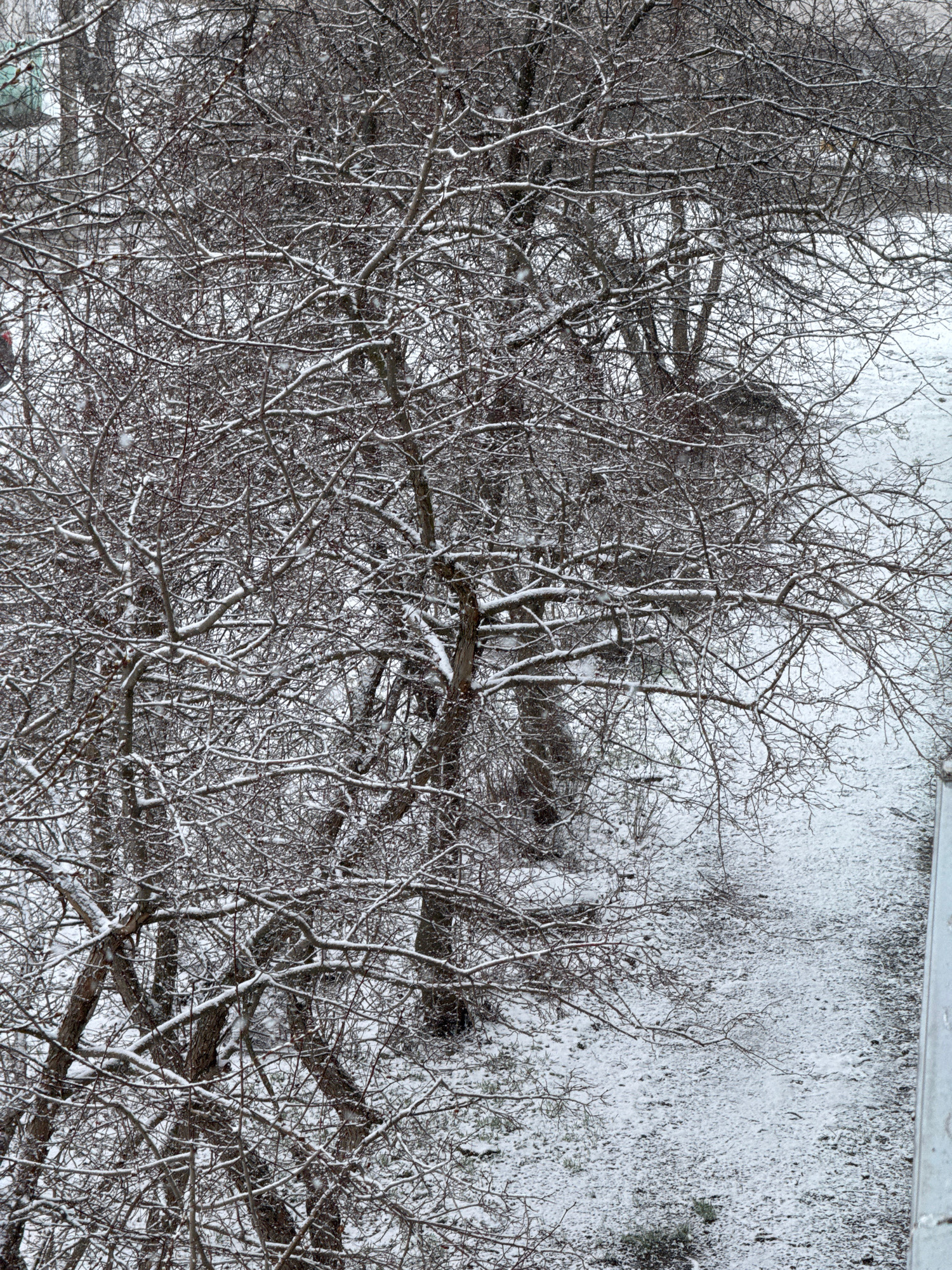The image shows a view from a window in Chaikovsky, Russia, looking out at a tree covered in snow. The branches are intricate and bare, heavily laden with snow. In the background, a snowy surface, pos…read more