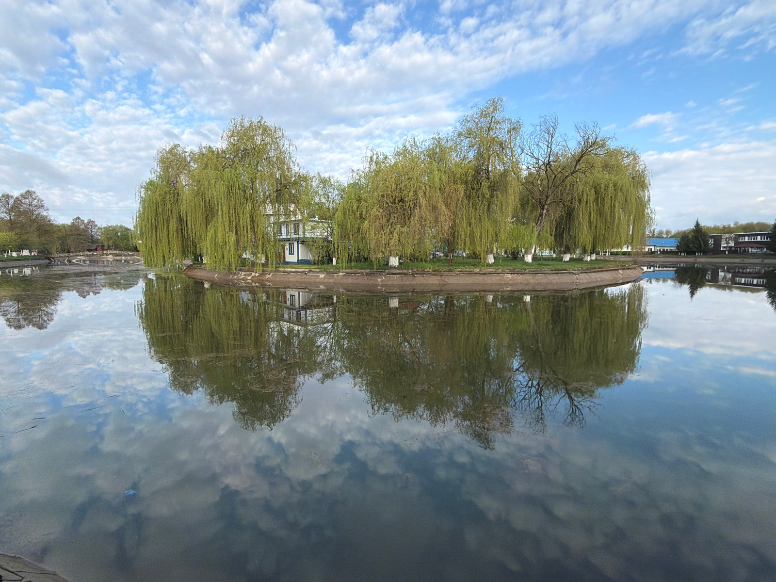 This image depicts a serene landscape featuring a small, verdant island surrounded by calm water under a partly cloudy sky. The scene is likely set in a park or recreational area in Târgu Mureș, Roman…read more