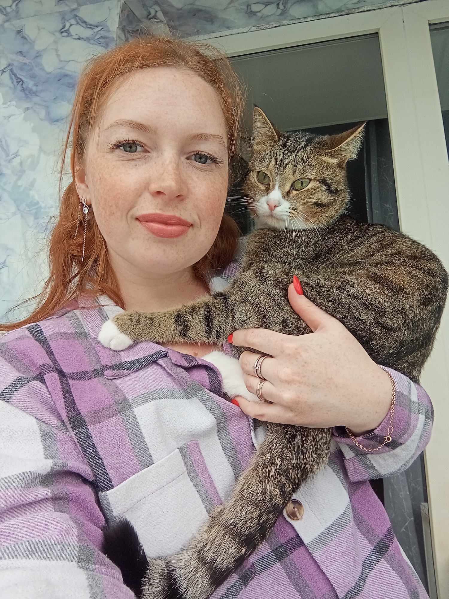 A reddish-haired woman with freckles is holding a tabby cat. She is wearing a light purple and white plaid shirt. Her hair is long and parted to the side, with long, thin, silver earrings. She has red…read more