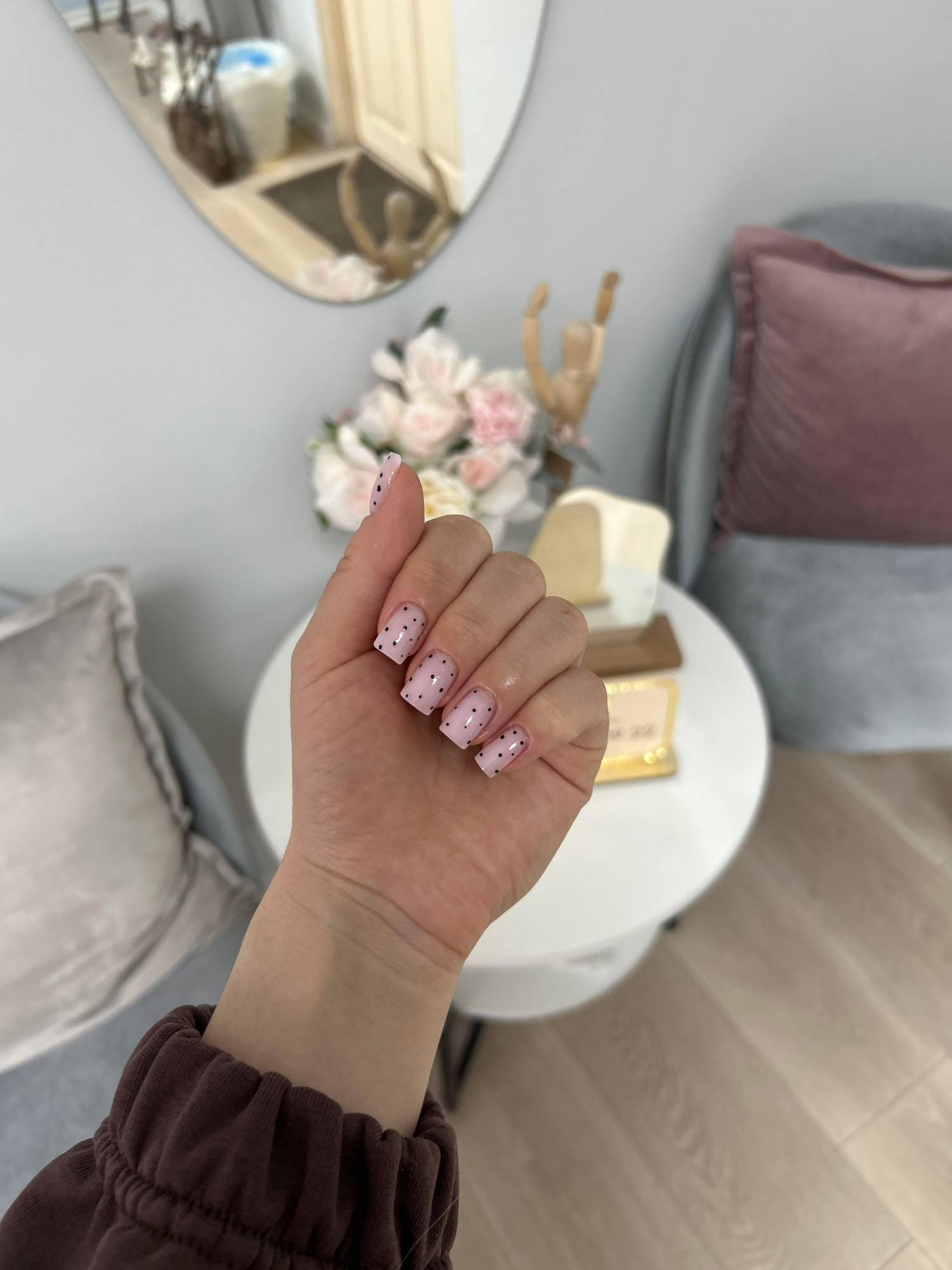 A hand is extended in the center of the frame, displaying a manicure with pale pink nails adorned with black polka dots. The hand is part of a person wearing a brown long-sleeved garment. The backgrou…read more