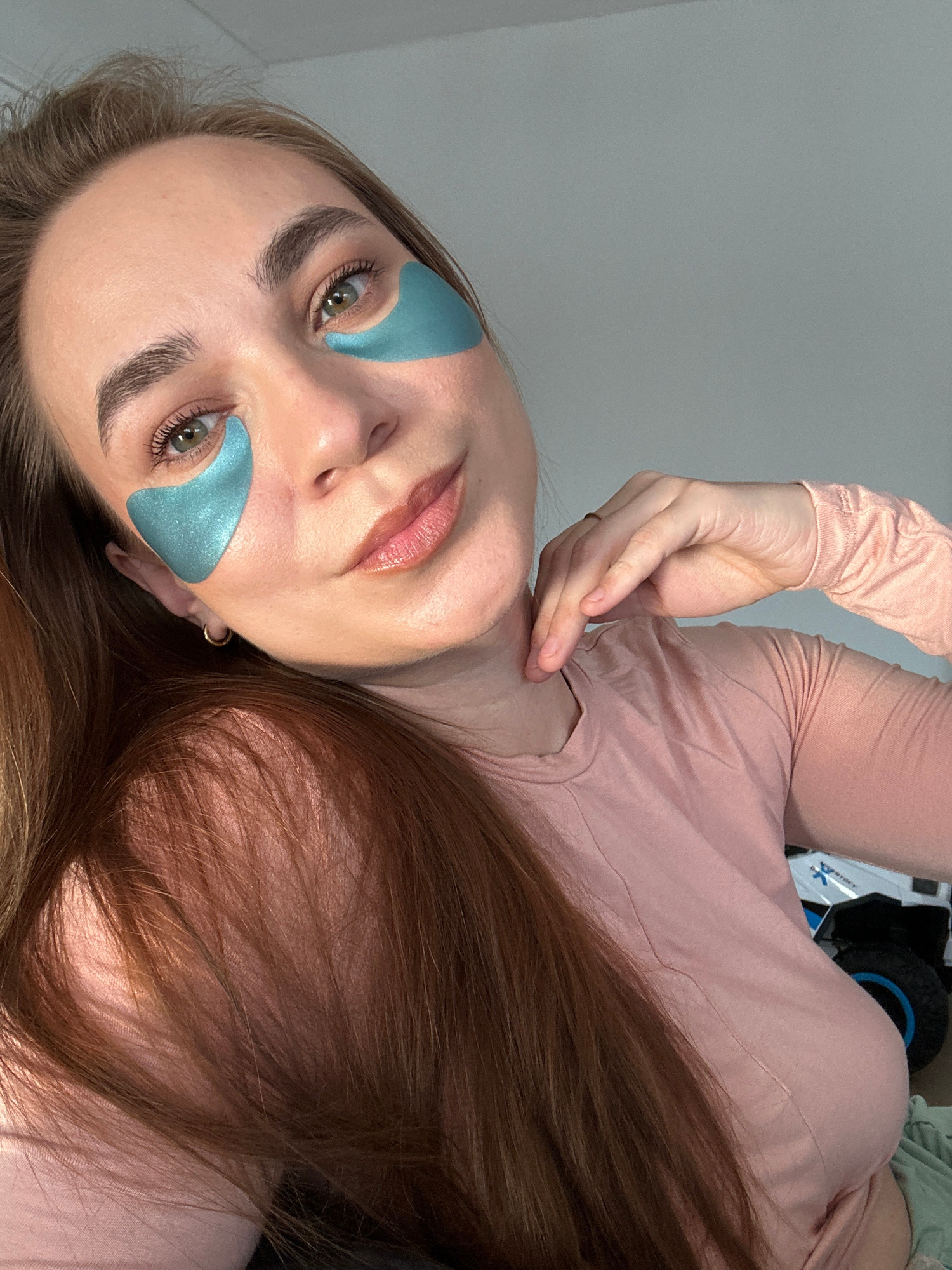 A woman is pictured indoors with a pale-pink long-sleeved shirt, applying iridescent blue triangular under-eye patches. Her long brown hair is partially visible, and she is touching her neck with her…read more