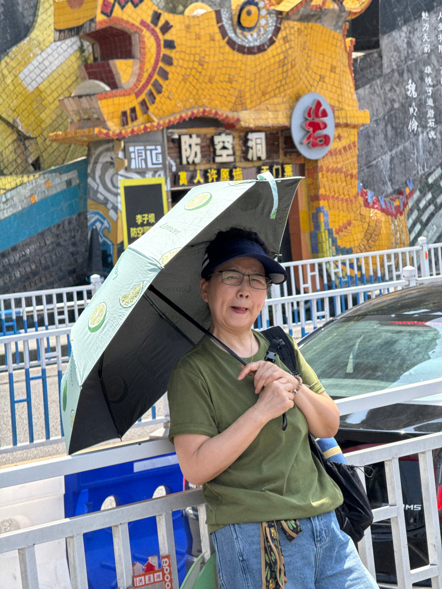This outdoor image, taken in Yuzhong District, China, features an individual holding an umbrella against a backdrop of a colorful mosaic structure. The subject, an East Asian person appearing middle-a…read more