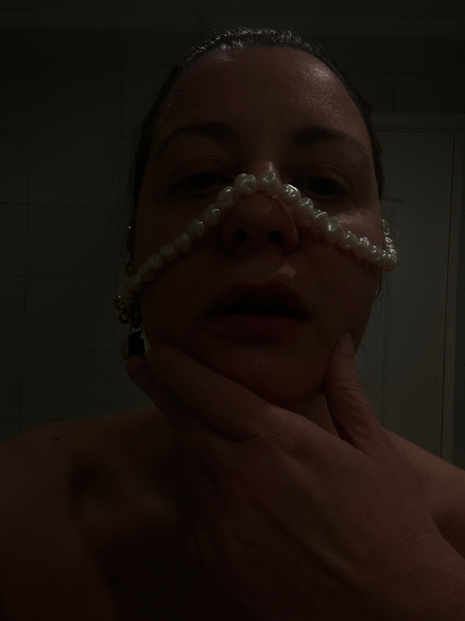 A low-angle close-up photograph depicts a person's face adorned with a string of white pearls draped across the nose. The person's dark hair is visible. A human hand touches the person's cheek. The imβ¦read more
