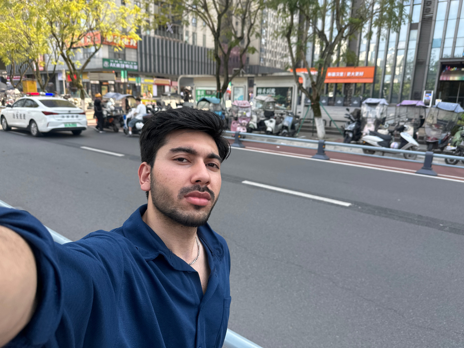 An overhead-style selfie captures a man from the chest up, oriented upside down. He has dark hair, a beard, and is wearing a dark blue collared shirt with a silver chain around his neck. His expressio…read more
