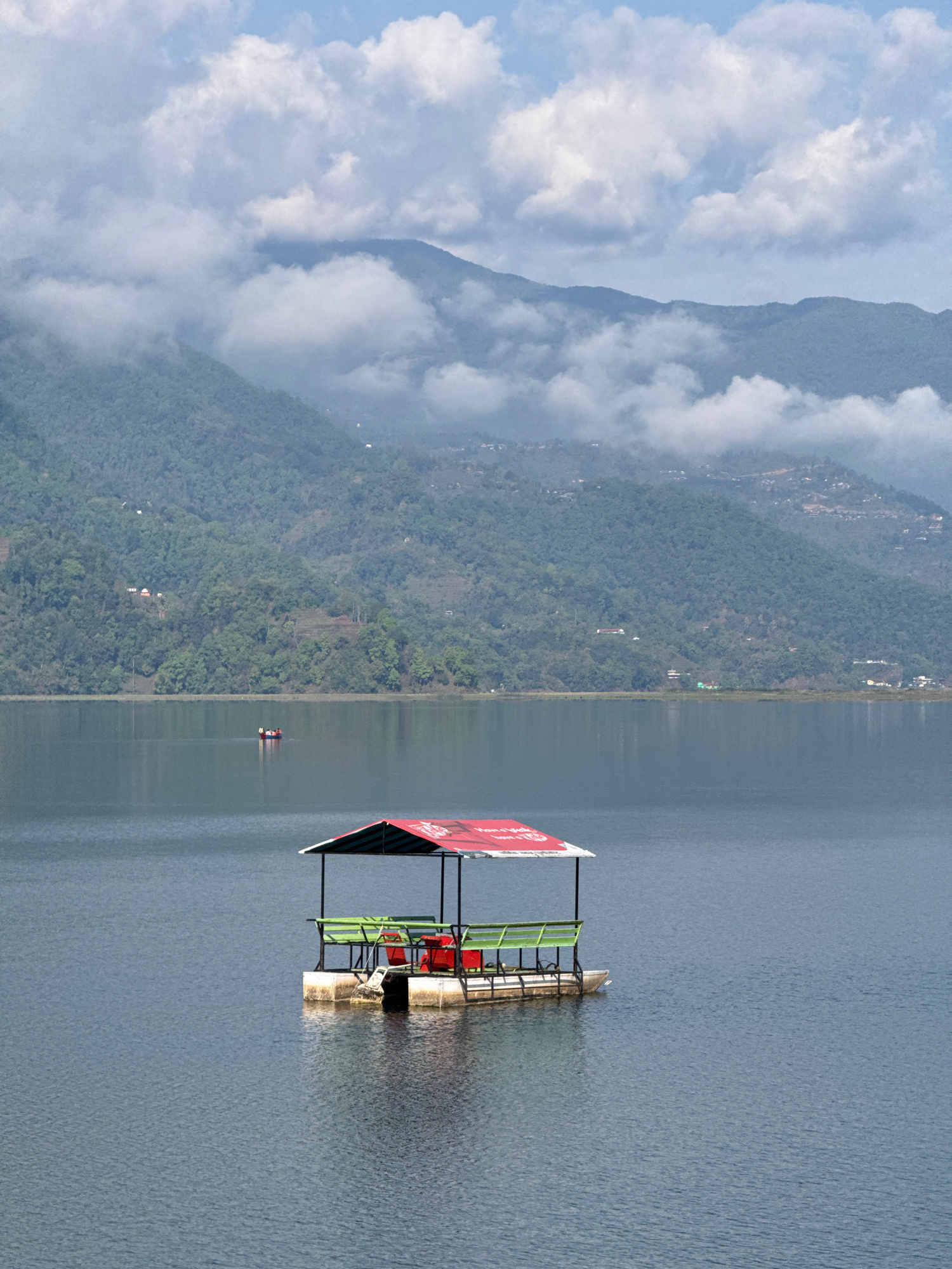 The image depicts Phewa Lake in Pokhara, Nepal, with a clear expanse of water reflecting the sky and surrounding mountains. A floating platform, featuring a red and black awning supported by a green m…read more