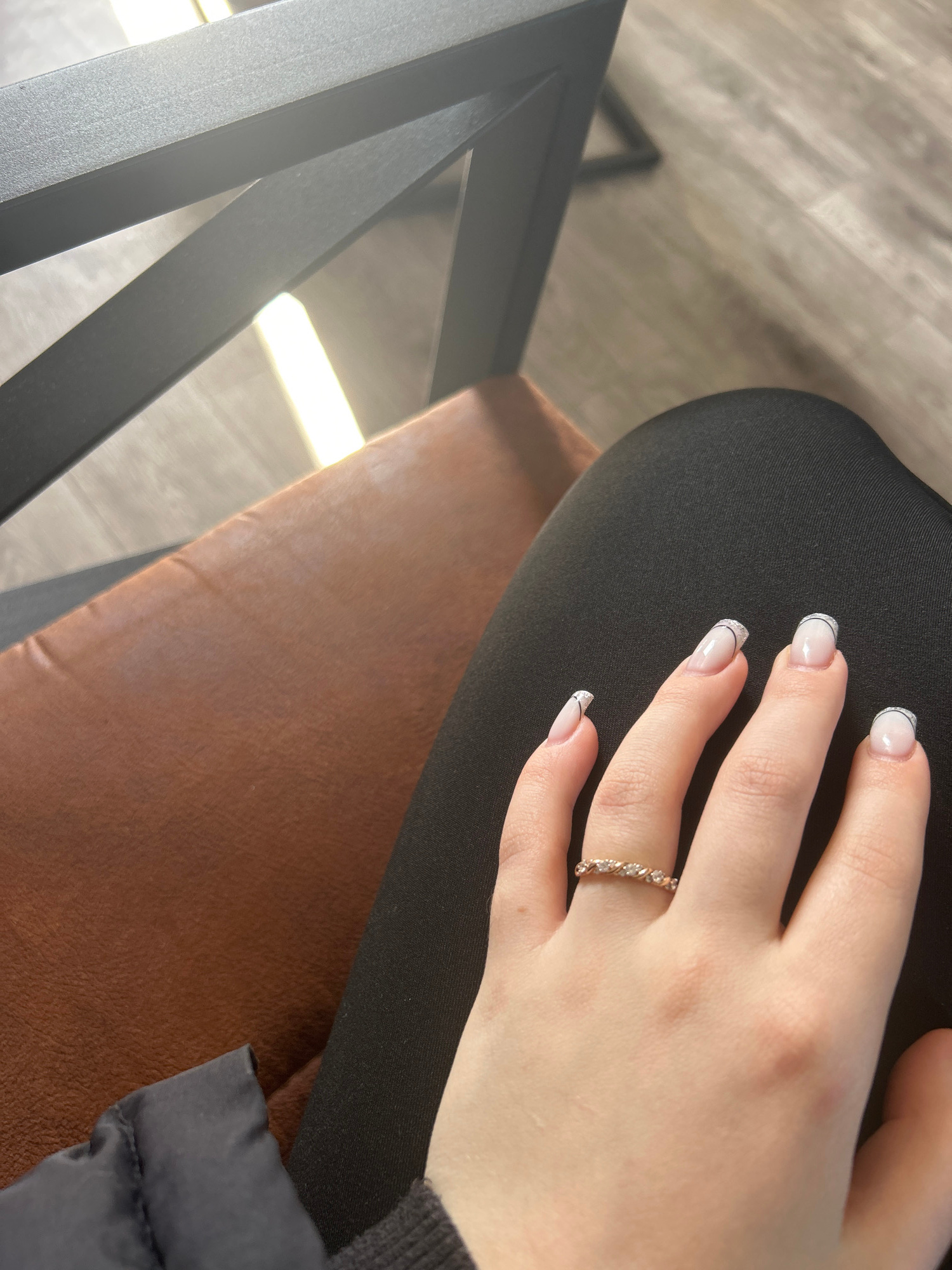 A close-up shot focuses on a person's left hand resting on a dark, possibly black, fabric surface. The hand features a ring on the ring finger, appearing to be a band of small, possibly diamond-like,…read more