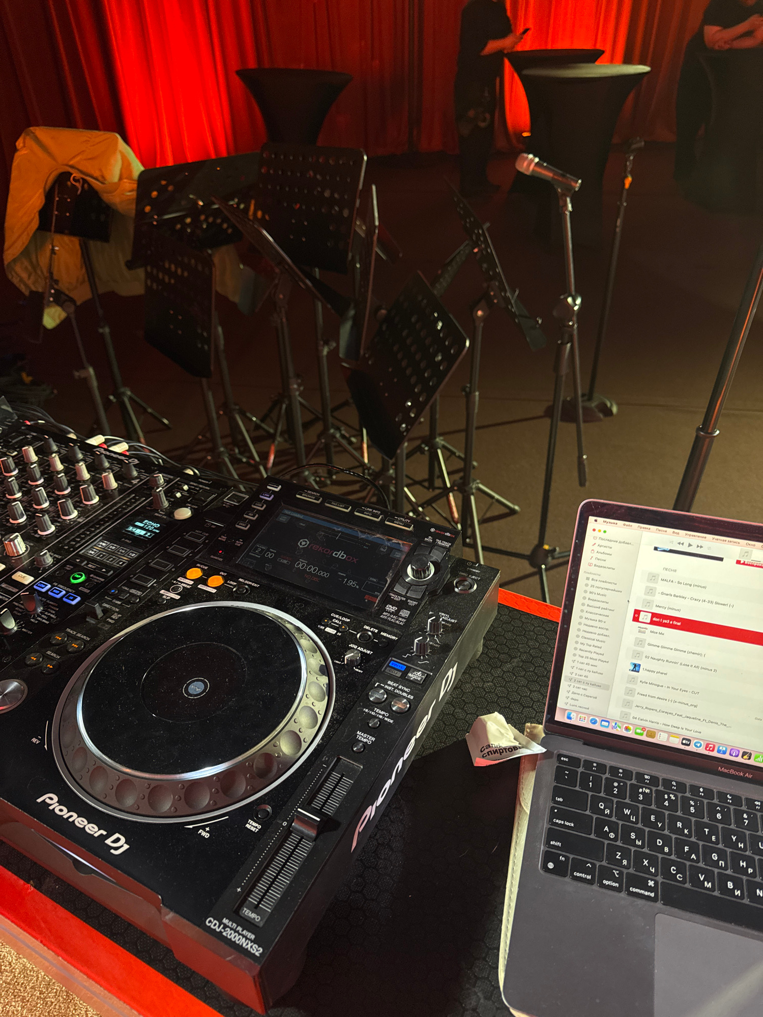 An overhead view captures a DJ setup and stage area, likely at an indoor event in Khimki, Russia. The scene is dominated by professional audio equipment, including a Pioneer DJ CDJ-2000NXS2 multi-play…read more
