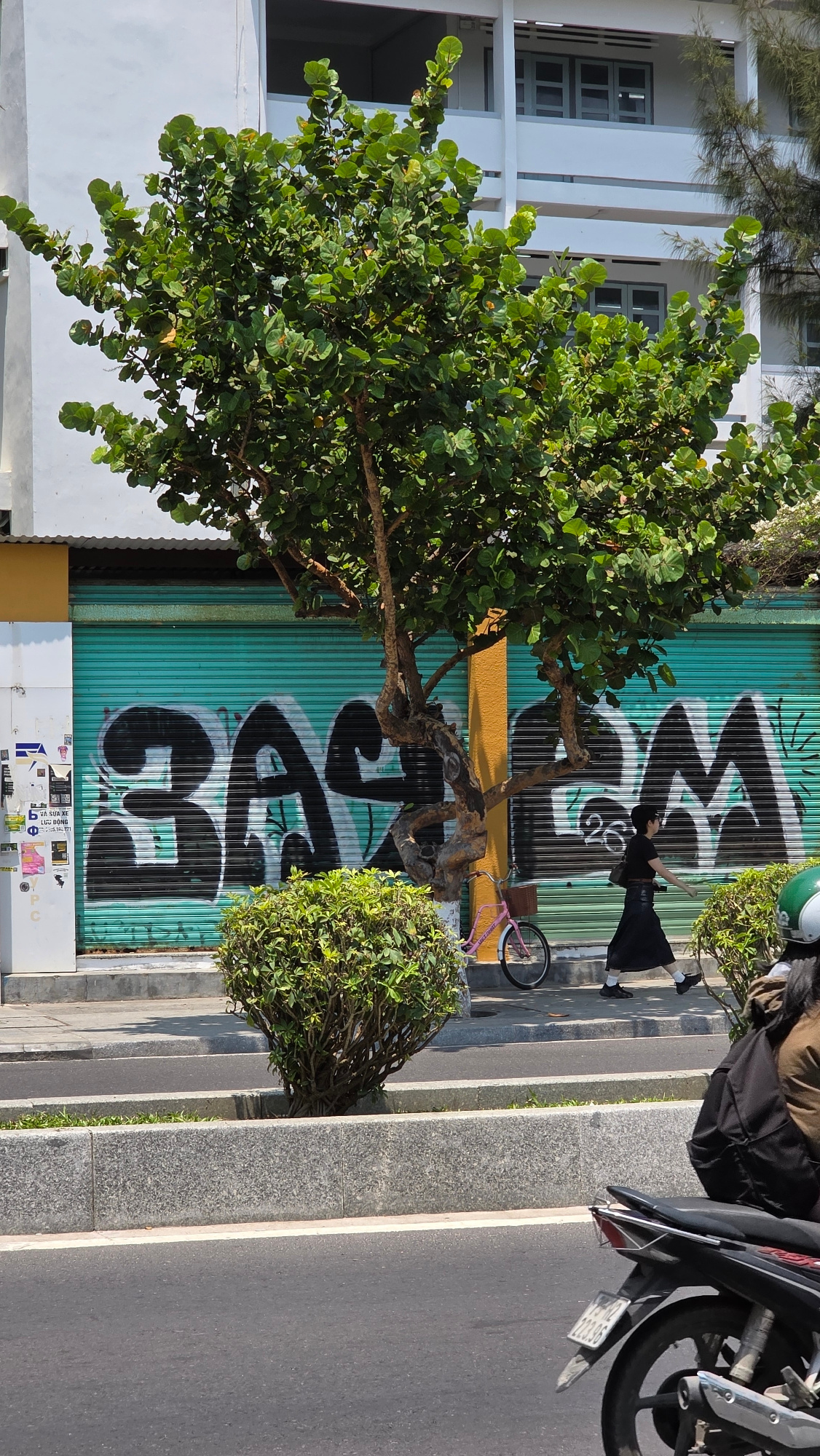 The image shows an urban street scene in Nha Trang, Vietnam. A large tree with green foliage dominates the left side of the frame, partially obscuring a white building with grey windows. Behind the tr…read more