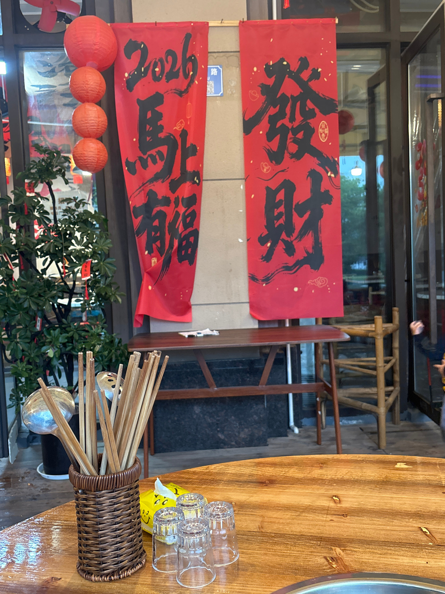 The image depicts an outdoor scene in Jiangjin, China, showing the exterior of a restaurant. Two red banners with black Chinese calligraphy hang above, possibly advertising the establishment or convey…read more