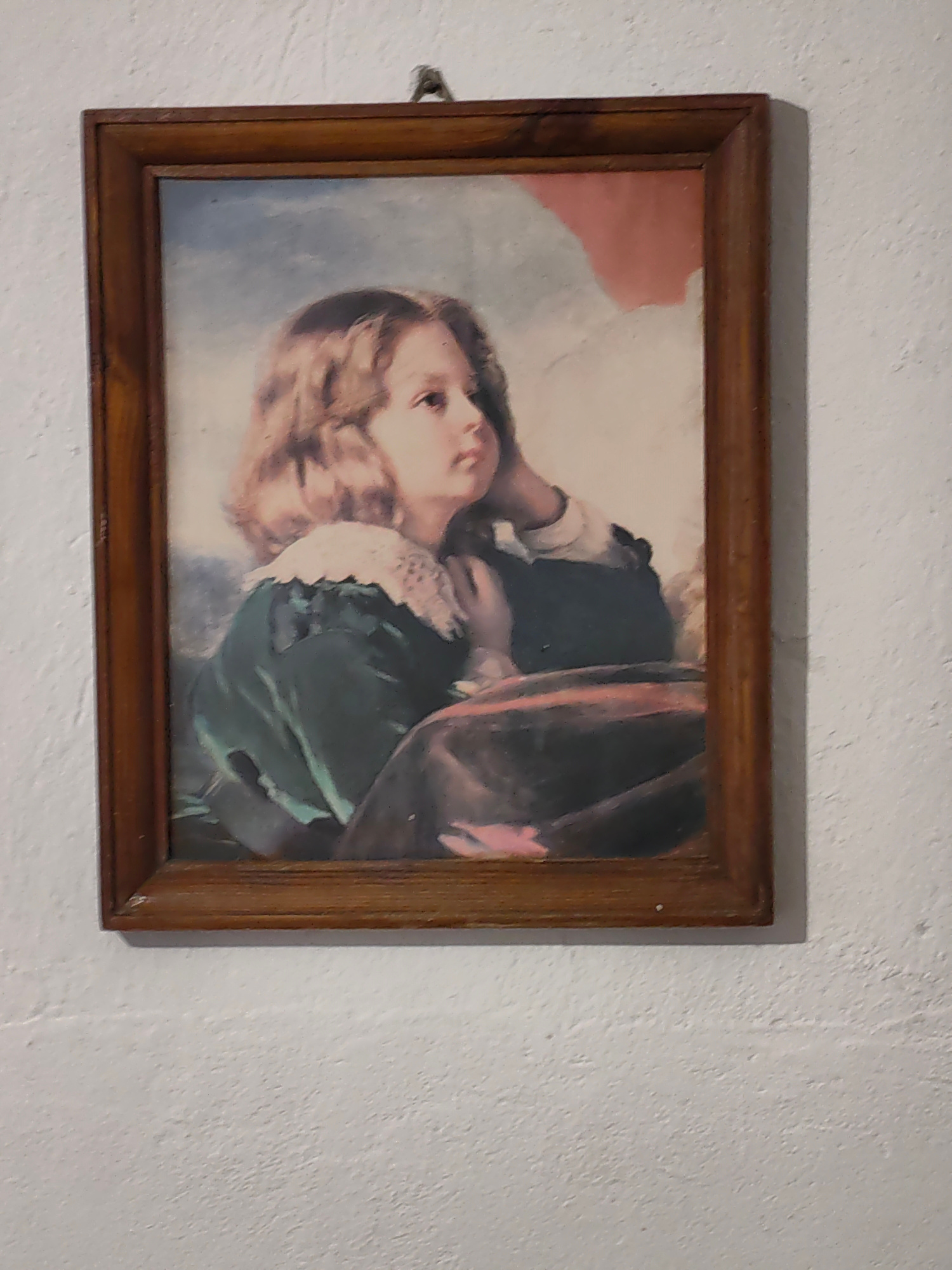 A framed portrait hangs on a textured, off-white wall. The frame is brown wood. The portrait appears to be a painting of a young child with light brown, wavy hair and fair skin. The child is looking o…read more
