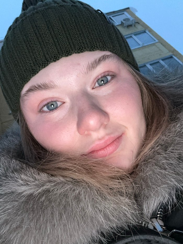A woman's face dominates the frame, tilted slightly to the side, with light skin, pale pink lips, and blue-gray eyes. She wears a dark green beanie and a fur-trimmed jacket. Part of a light yellow bui…read more