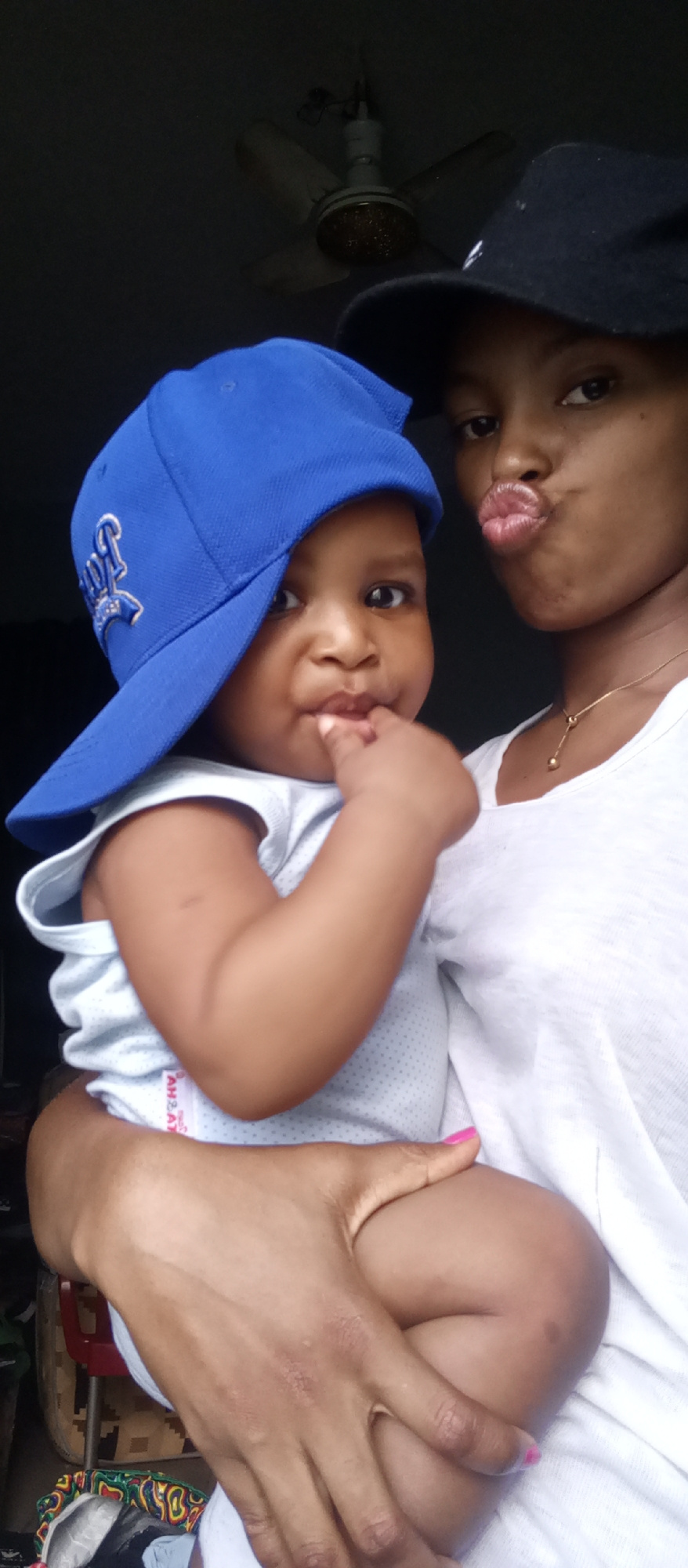 A woman and a baby are posing for a photo in an indoor location. The woman, who is light-skinned, is wearing a white t-shirt and a black baseball cap, and she is making a kissing face. She has a gold…read more